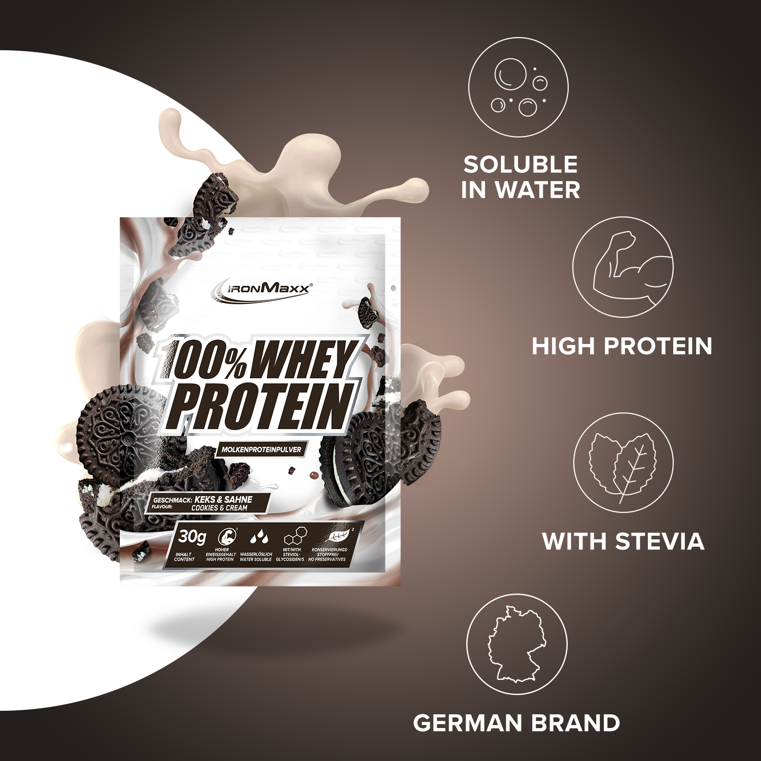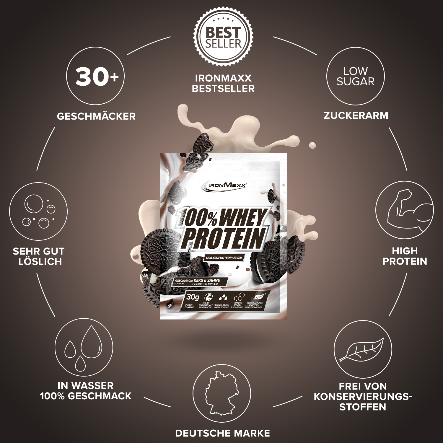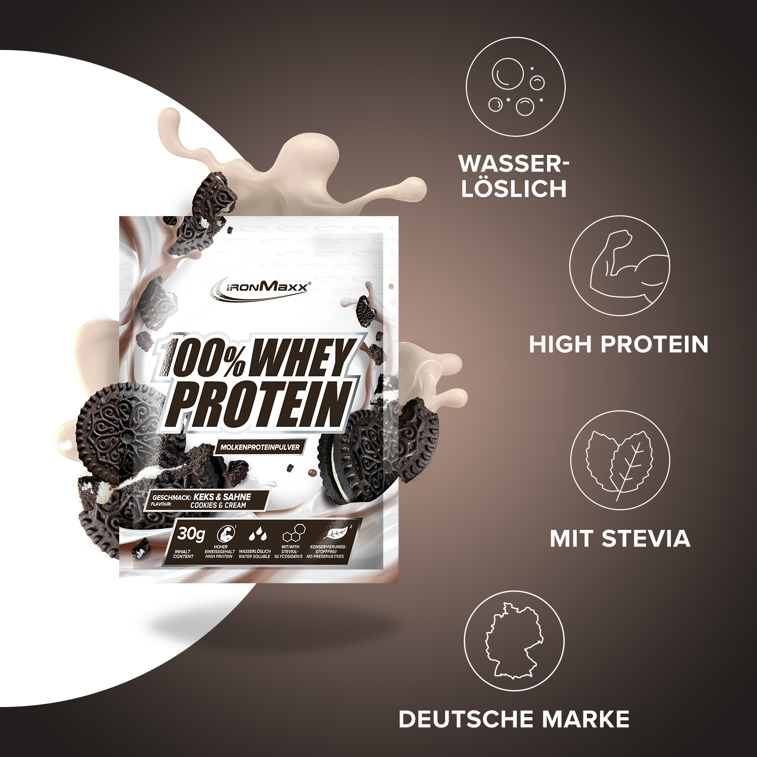 Verkehrsbezeichnung: Molkeneiweißkonzentrat zur Herstellung eines Sportlergetränkes. Mit Süßungsmitteln. Geschmack: Keks und Sahne.