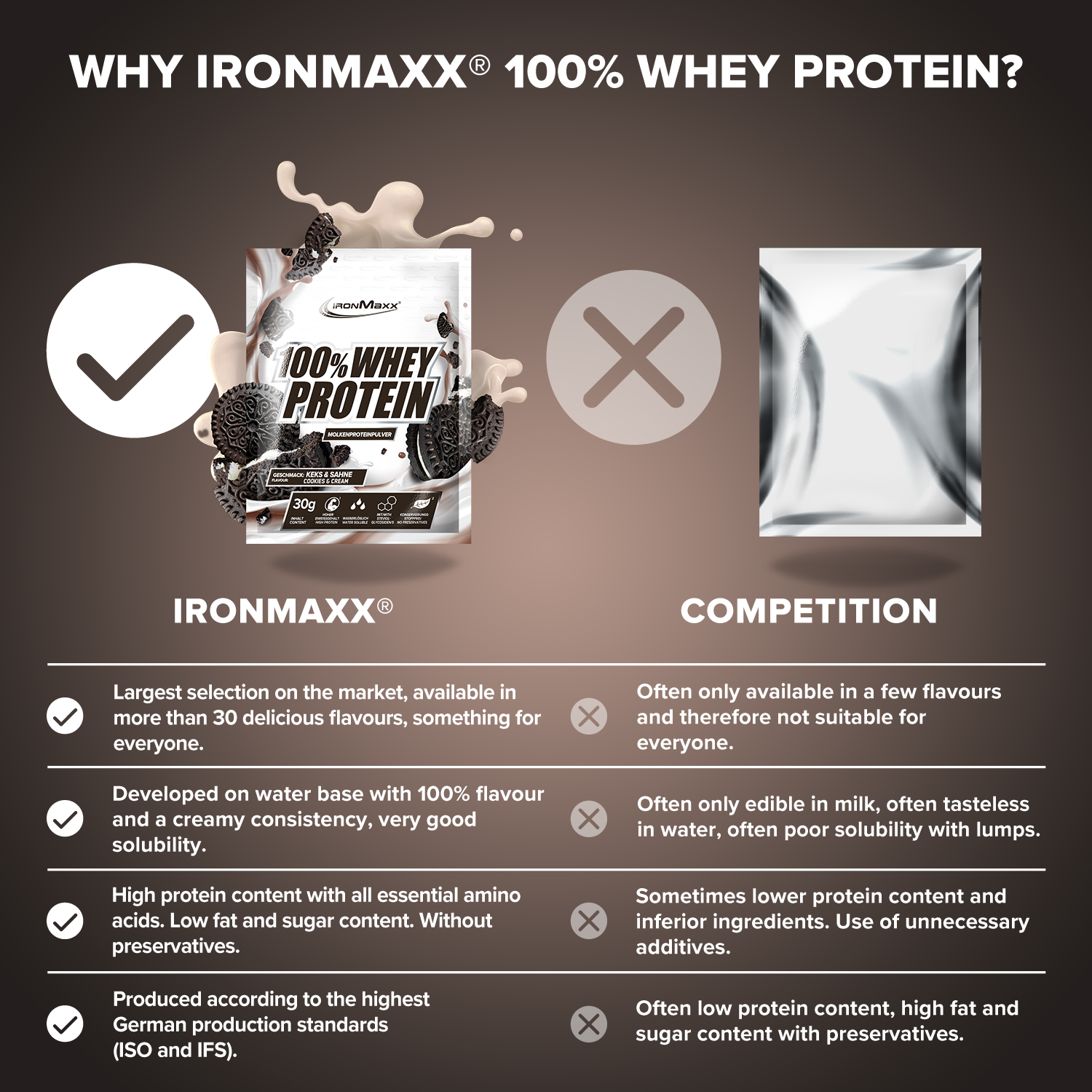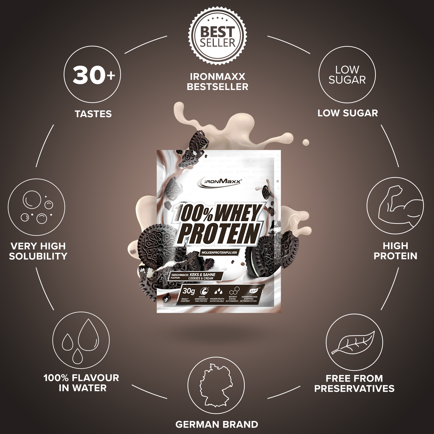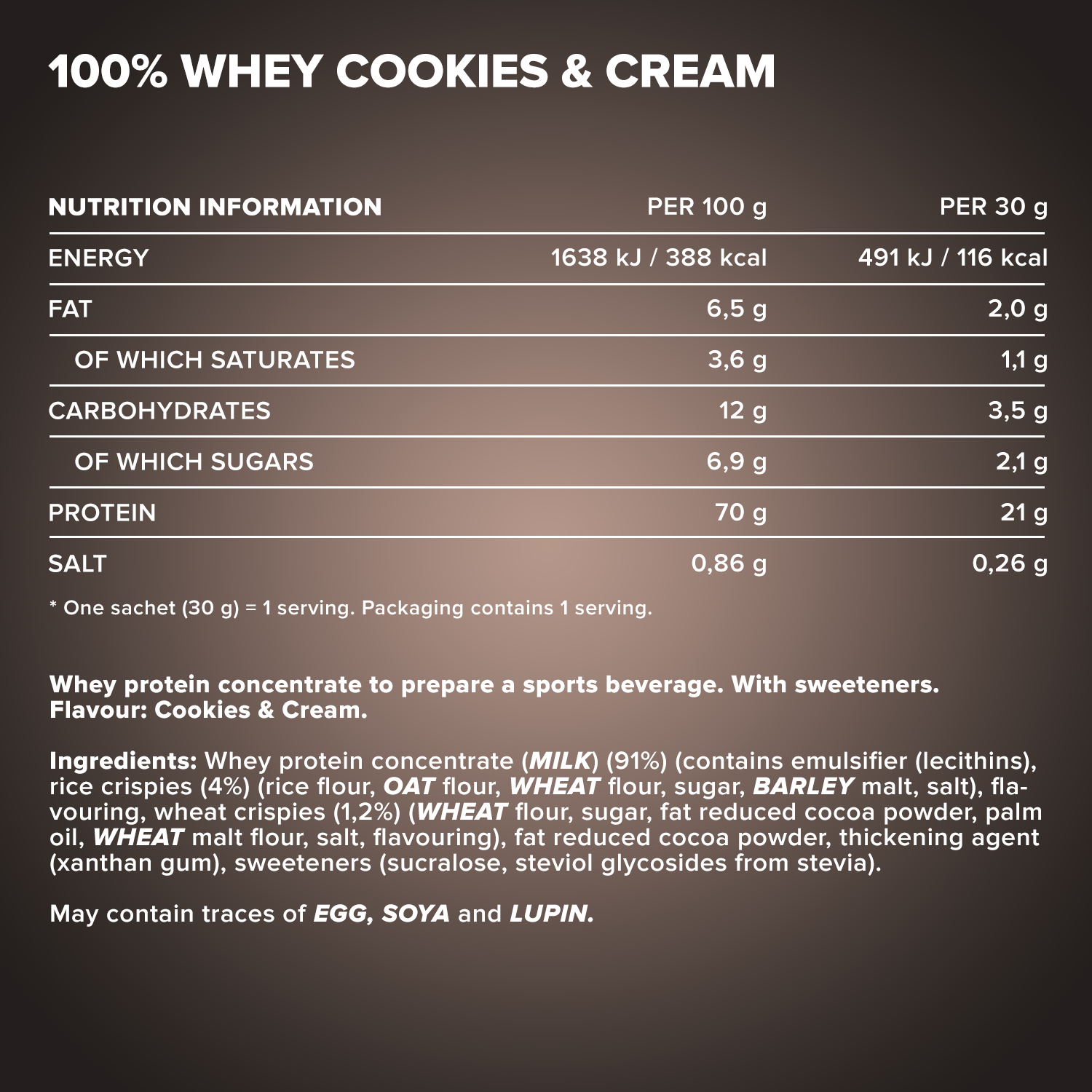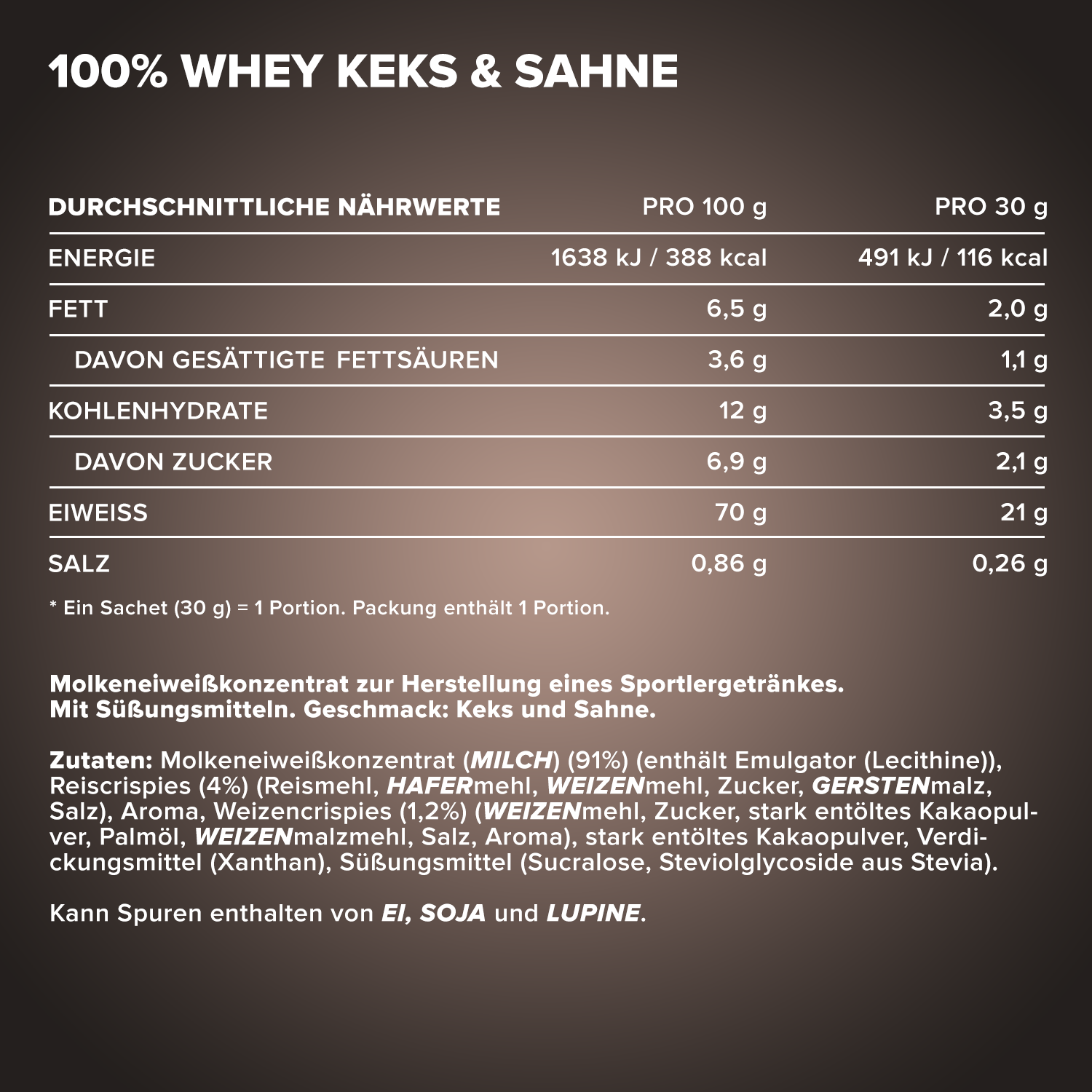 ²Eine Portion enthält 30 g Pulver und 200 ml Wasser oder Milch.³In unserem Designer Whey verwenden wir keinen zugesetzten Zucker, sondern setzen auf unbedenkliche