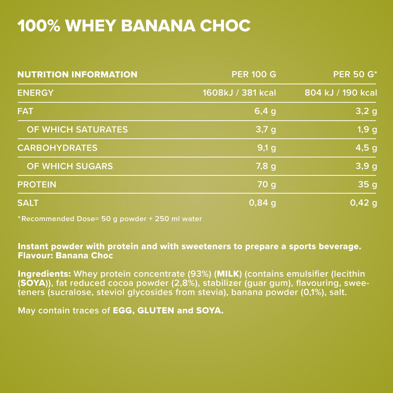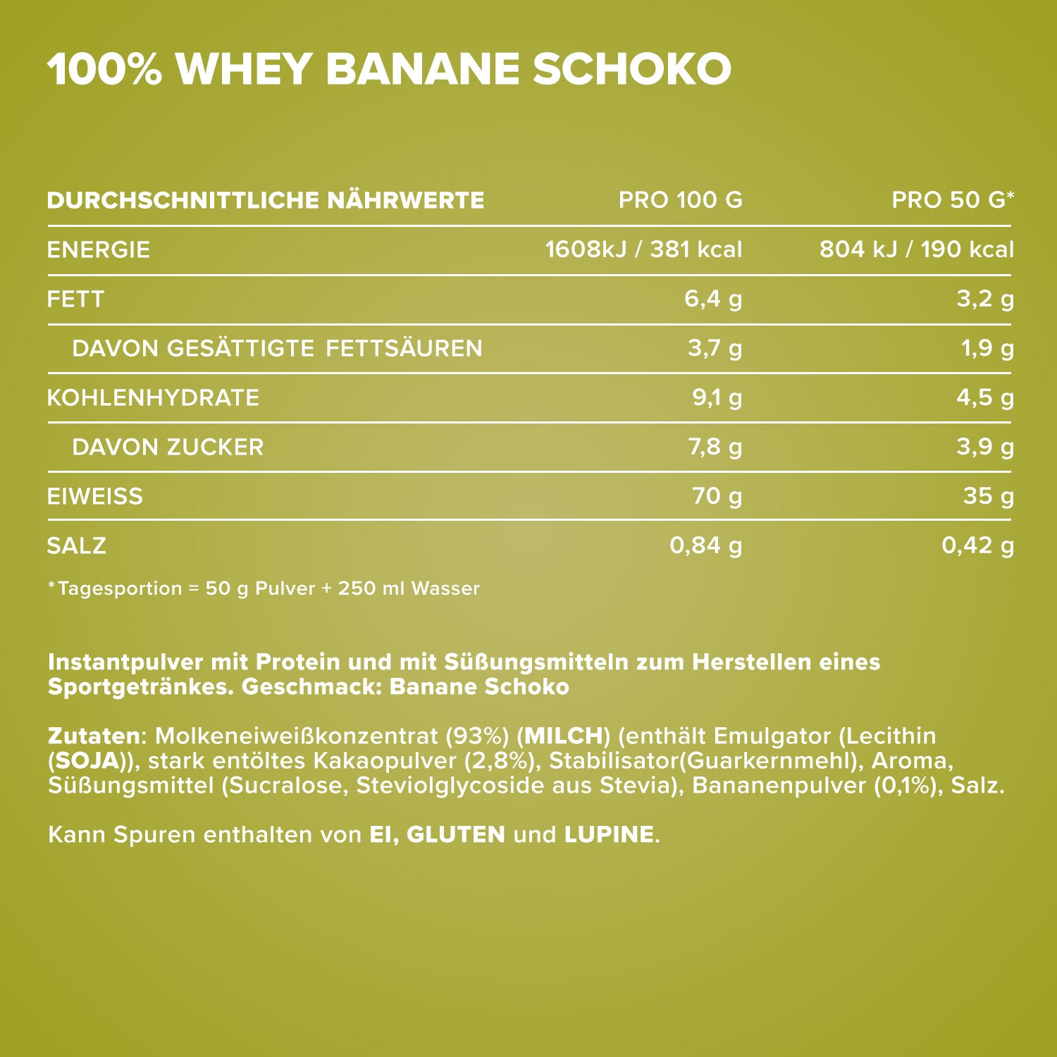 Molkeneiweißkonzentrat (93%) (MILCH) (enthält Emulgator (Lecithin (SOJA)), stark entöltes Kakaopulver (2,8%), Stabilisator (Guarkernmehl), Aroma, Süßungsmittel (Sucralose, Steviolglycoside aus Stevia), Bananenpulver (0,1%), Salz