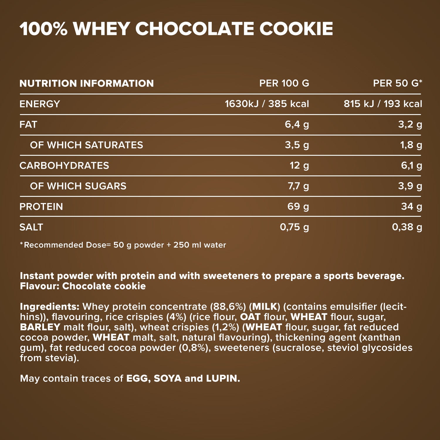 Molkeneiweißkonzentrat (88,6%) (MILCH) (enthält Emulgator (Lecithine)), Aroma, Reiscrispies (4%) (Reismehl, HAFERmehl, WEIZENmehl, Zucker, GERSTENmalzmehl, Salz), Weizencrispies (1,2%) (WEIZENmehl, Zucker, stark entöltes Kakaopulver, WEIZENmalz, Salz, natürliches Aroma), Verdickungsmittel (Xanthan), stark entöltes Kakaopulver (0,8%), Süßungsmittel (Sucralose, Steviolglycoside aus Stevia)