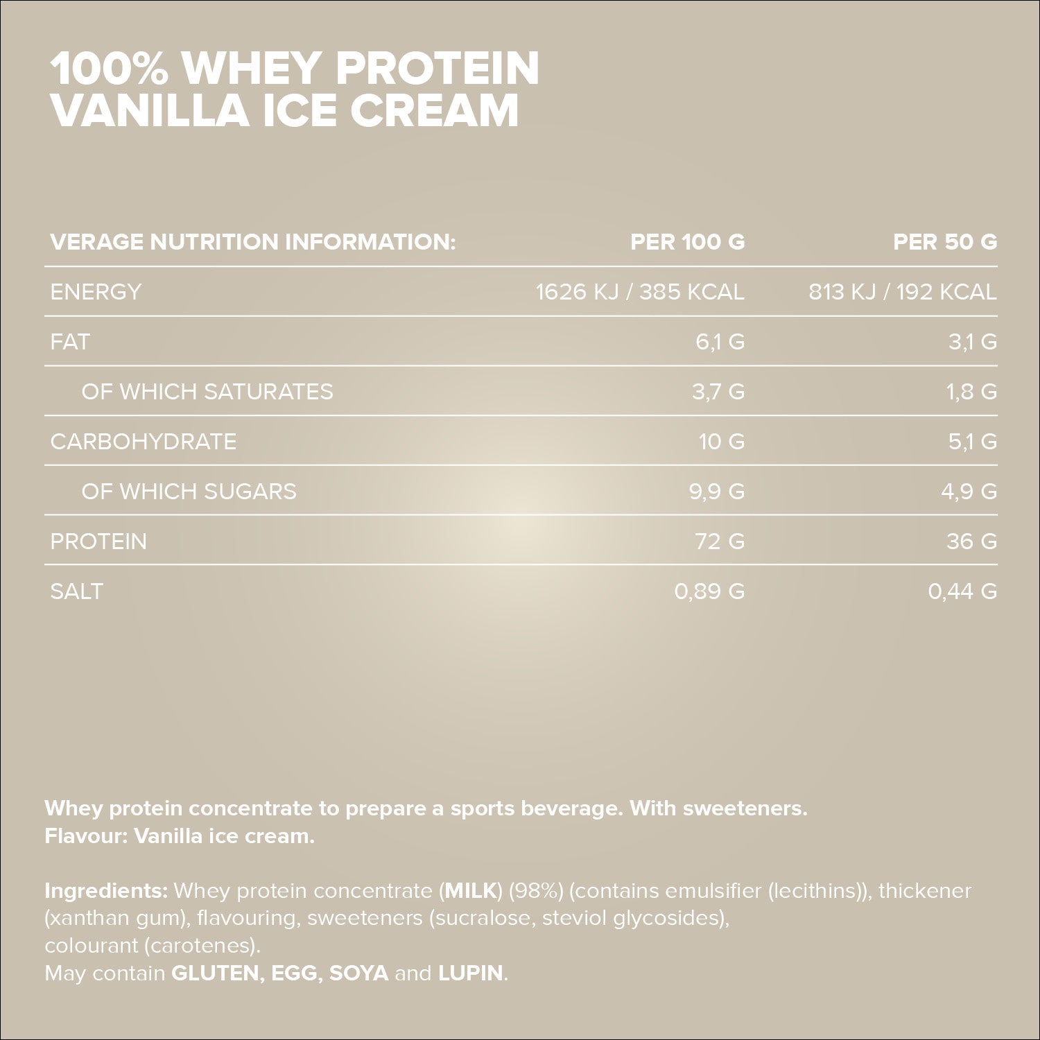 Molkeneiweißkonzentrat (MILCH) (98%) (enthält Emulgator (Lecithine)), Verdickungsmittel (Xanthan), Aroma, Süßungsmittel (Sucralose, Steviolglycoside aus Stevia), Farbstoff (Carotin).