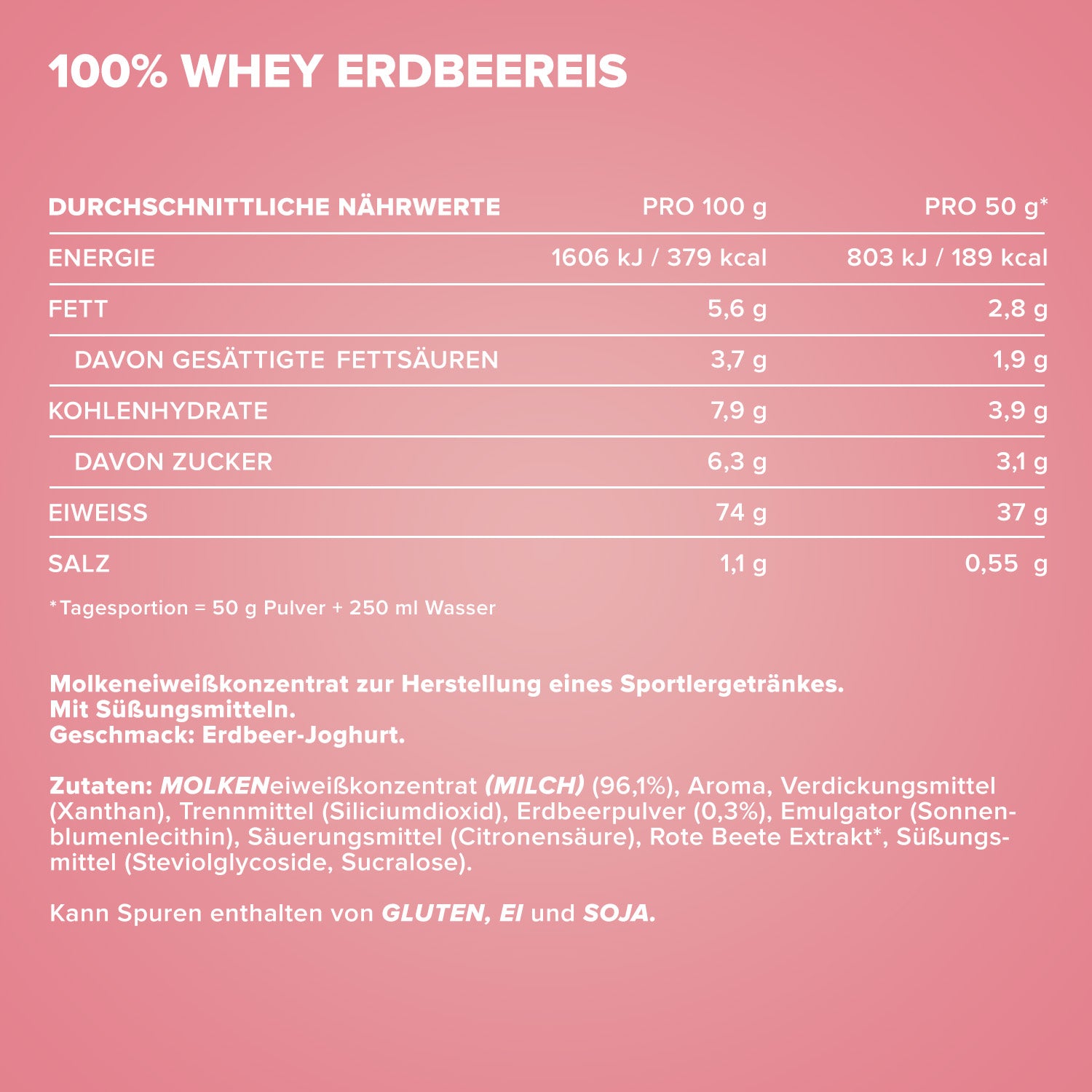 MOLKENeiweiß-Konzentrat (MILCH) (96,1%), Aroma, Verdickungsmittel (Xanthan), Trennmittel (Siliciumdioxid), Erdbeerpulver (0,3%), Emulgator (Sonnenblumenlecithin), Säuerungsmittel (Citronensäure), Rote Beete Extrakt*, Süßungsmittel (Steviolglykoside, Sucralose). Kann Spuren enthalten von GLUTEN, El und SOJA.