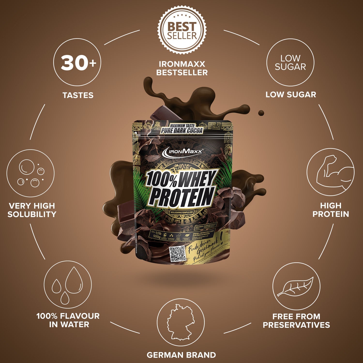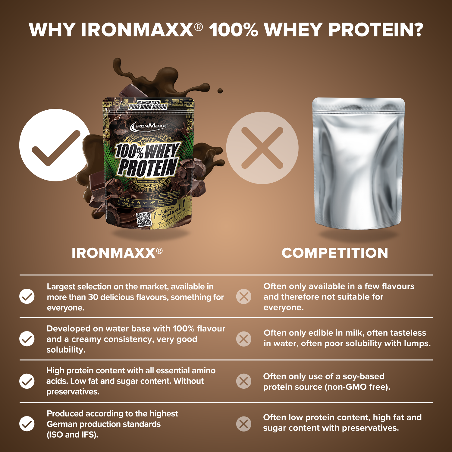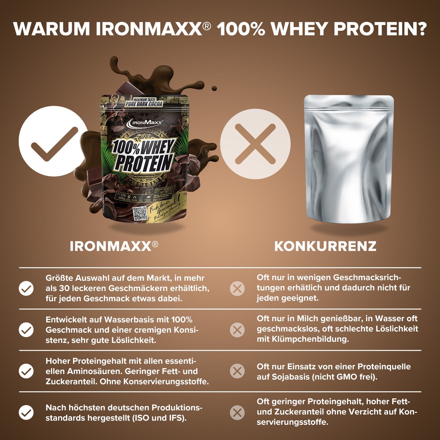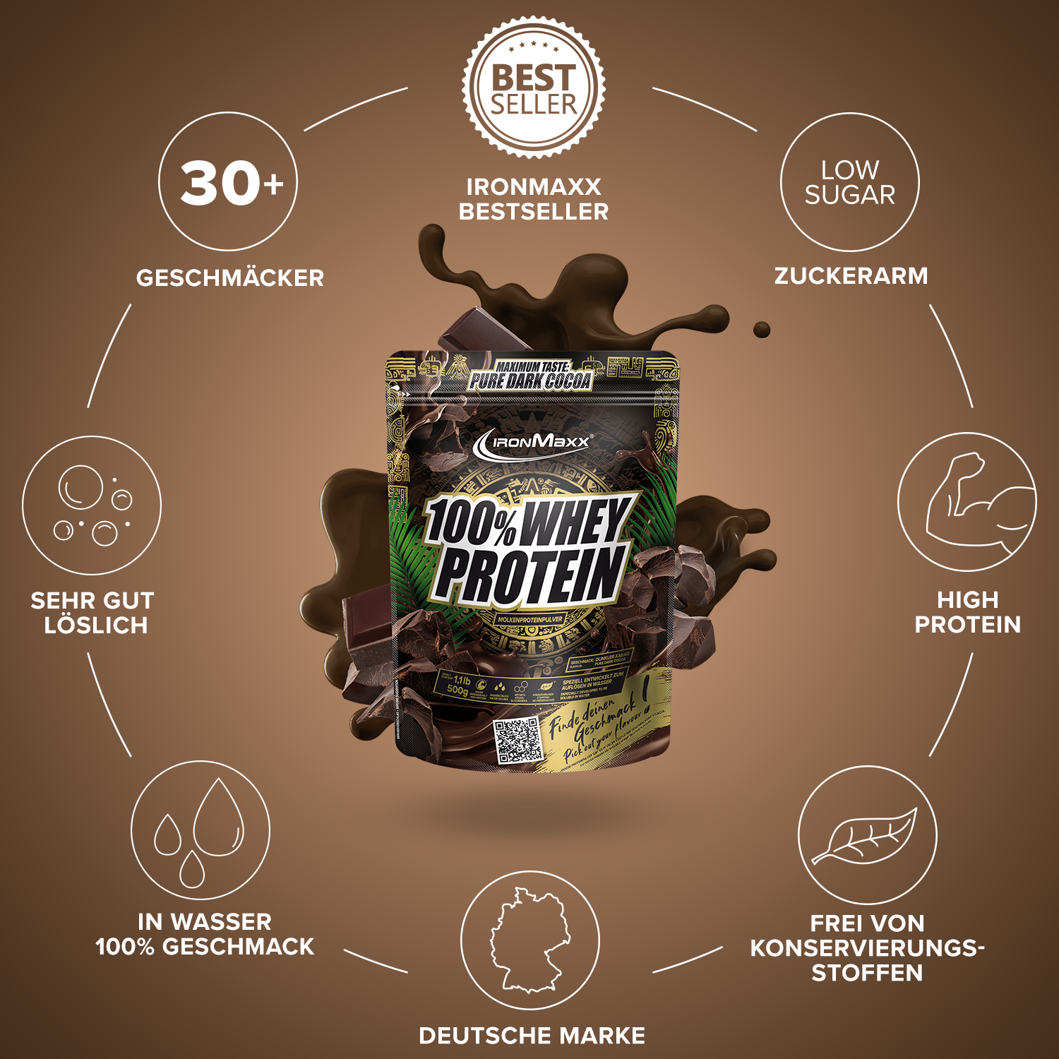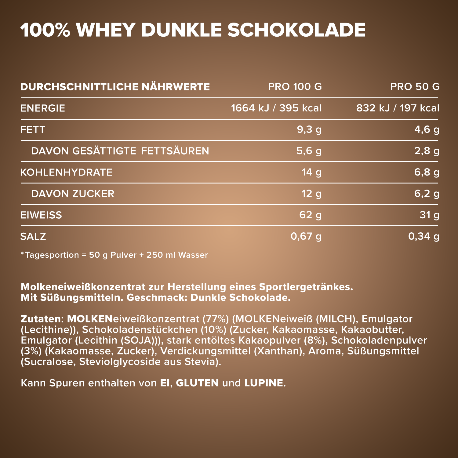 Verkehrsbezeichnung: Molkeneiweißkonzentrat zur Herstellung eines Sportlergetränkes. Mit Süßungsmitteln. Geschmack: Dunkle Schokolade