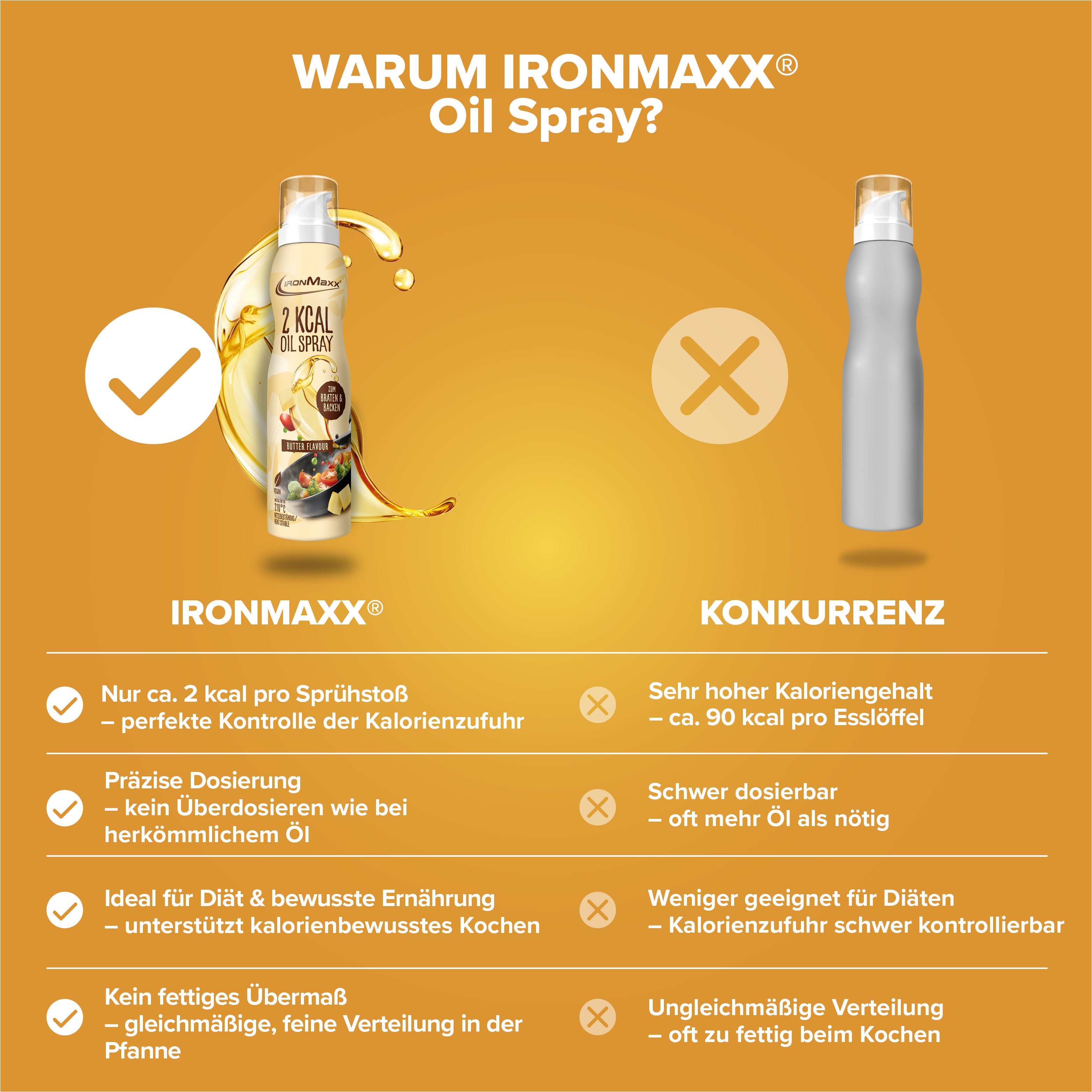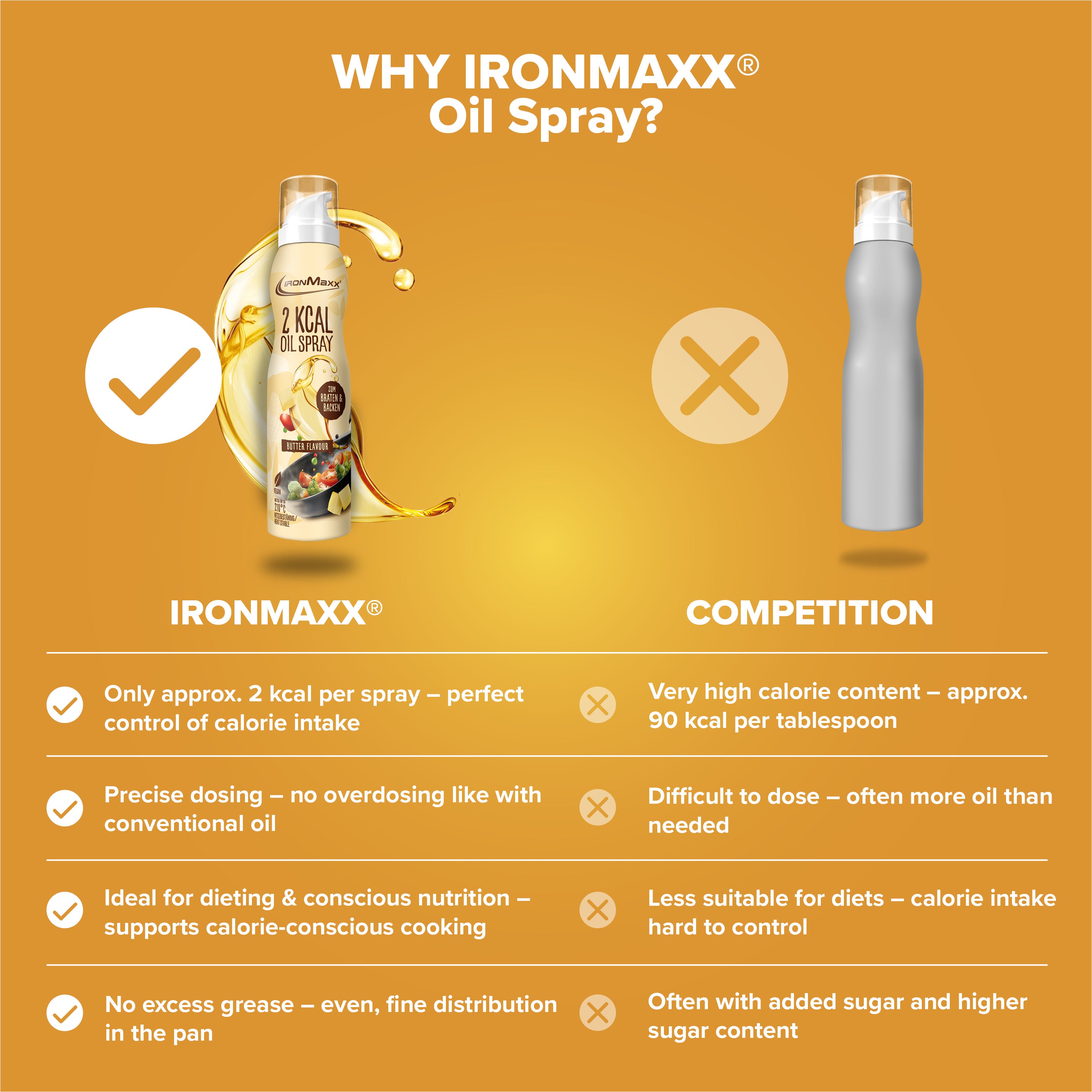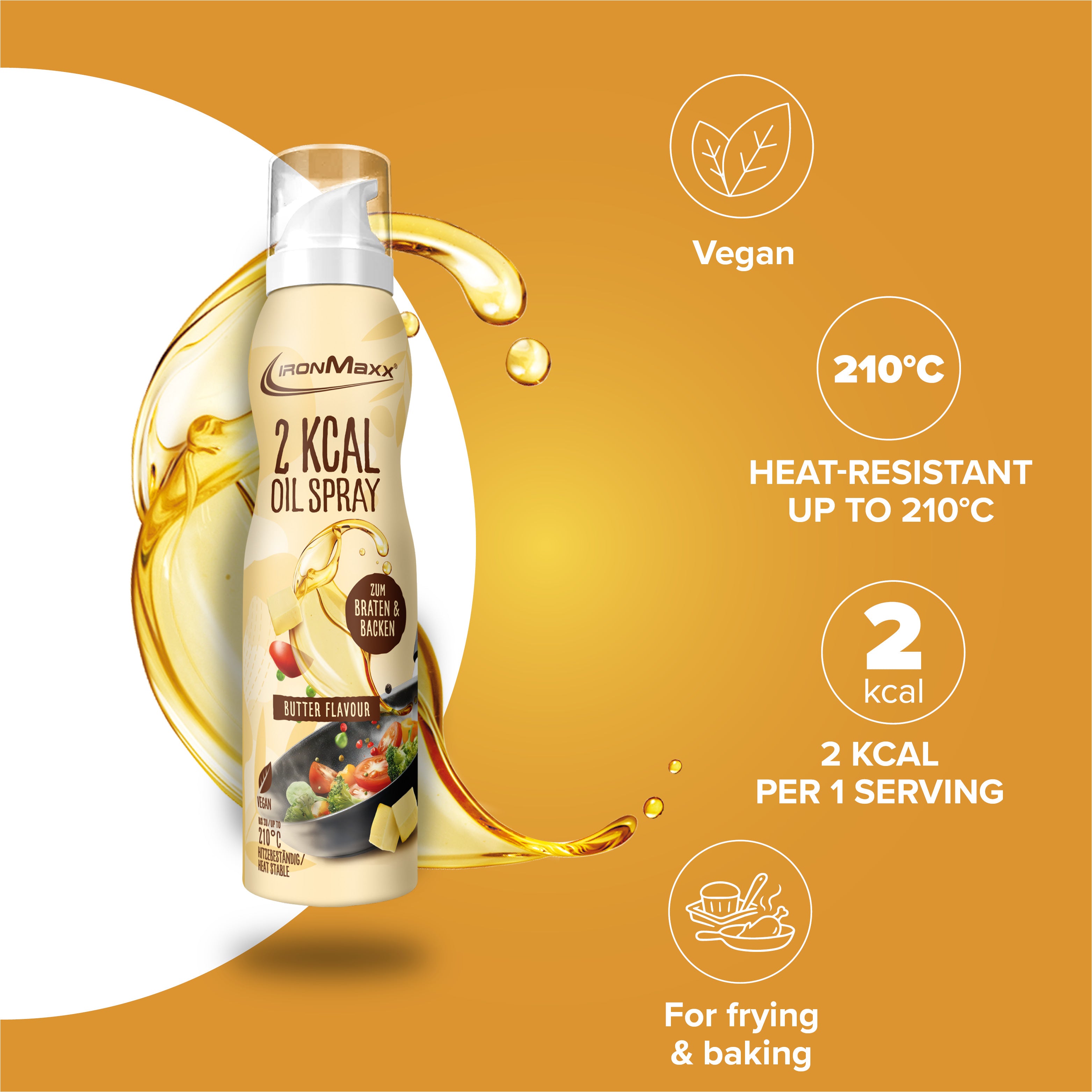 IronMaxx® 2 kcal Oil Spray ist ein praktisches Kochspray auf Rapsölbasis mit feinem Buttergeschmack – ideal zum Braten, Backen und Grillen. Dank der feinen Sprühfunktion lässt sich das Öl gleichmäßig und sparsam dosieren.