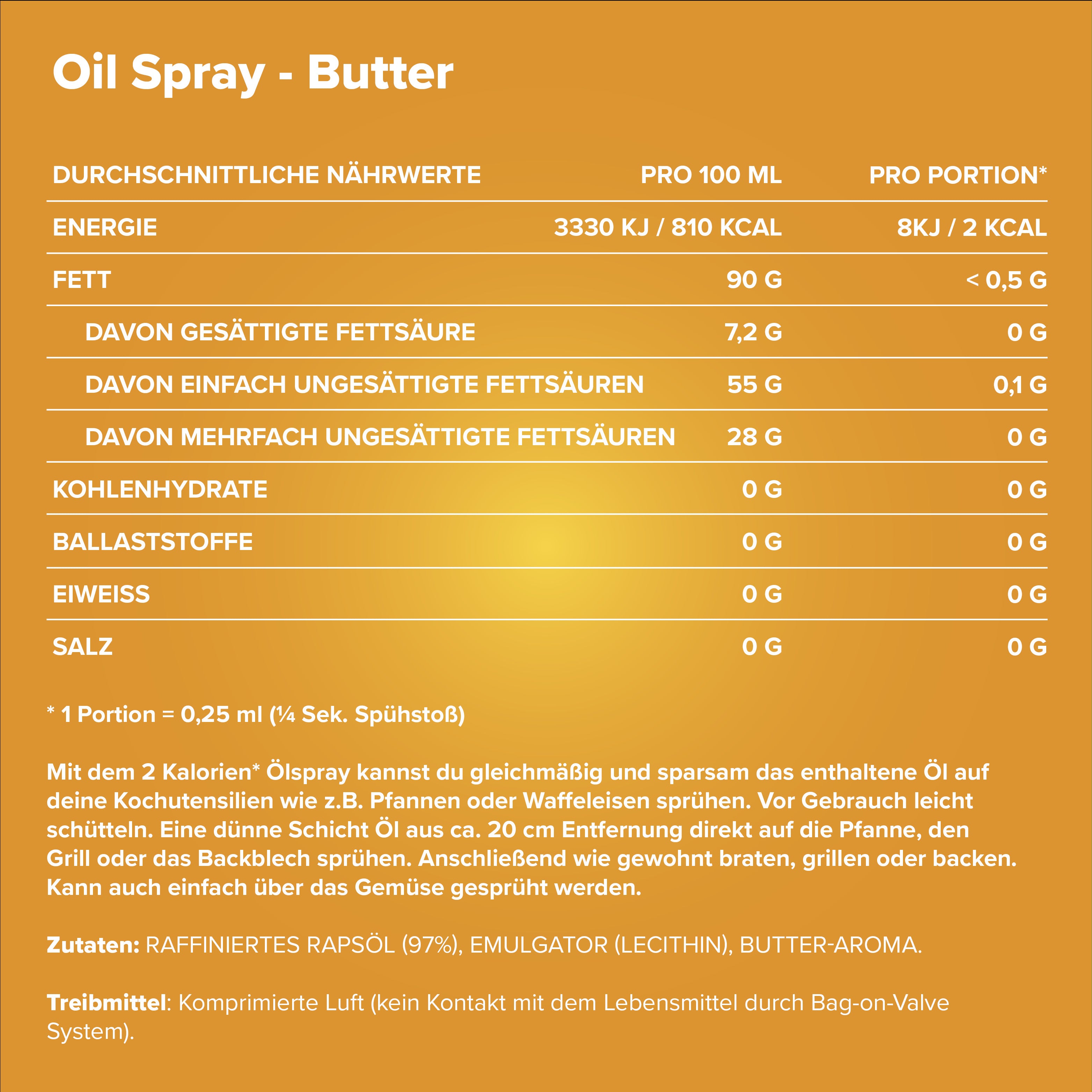 Raffiniertes Rapsöl (97%), Emulgator (Lecithin), Butter-Aroma.