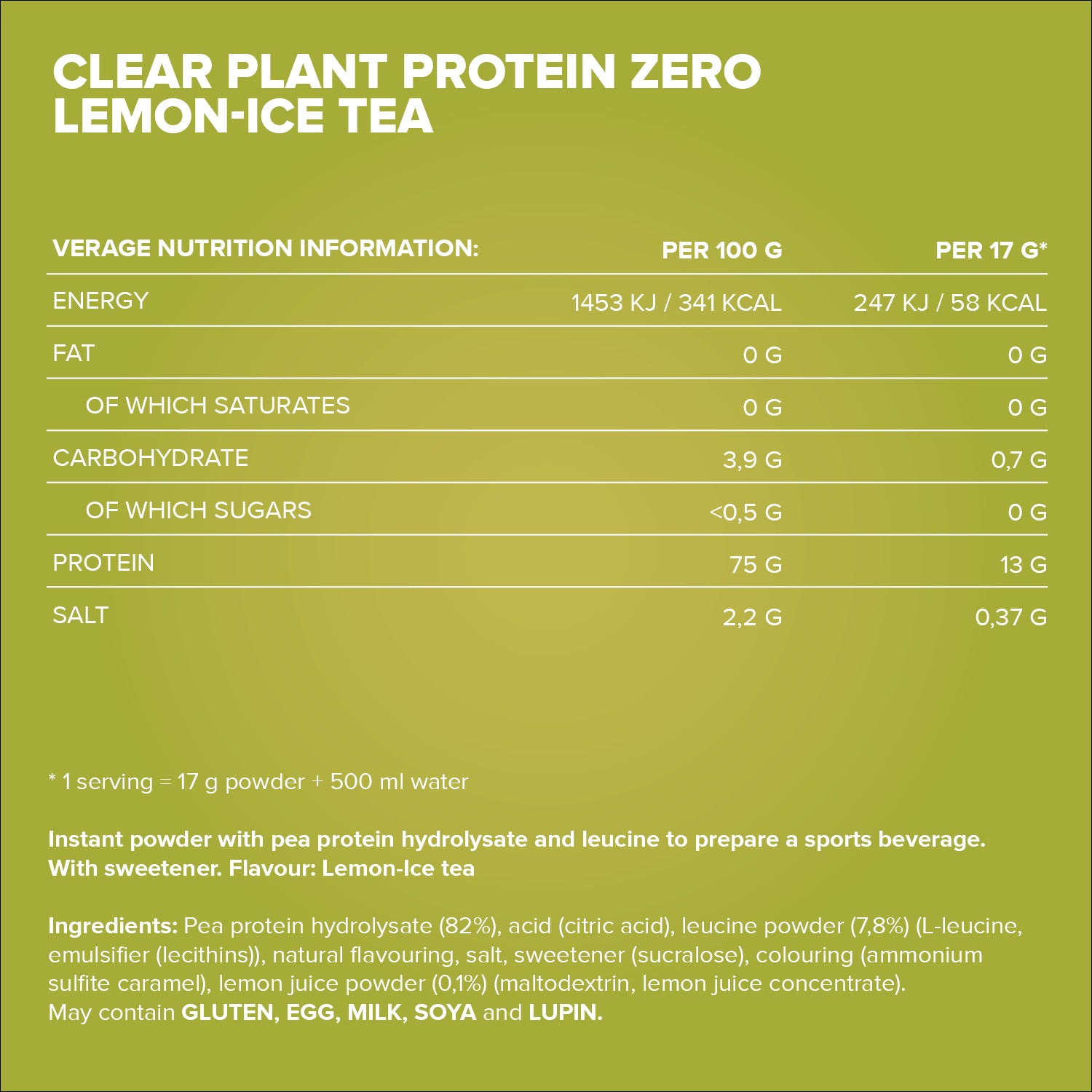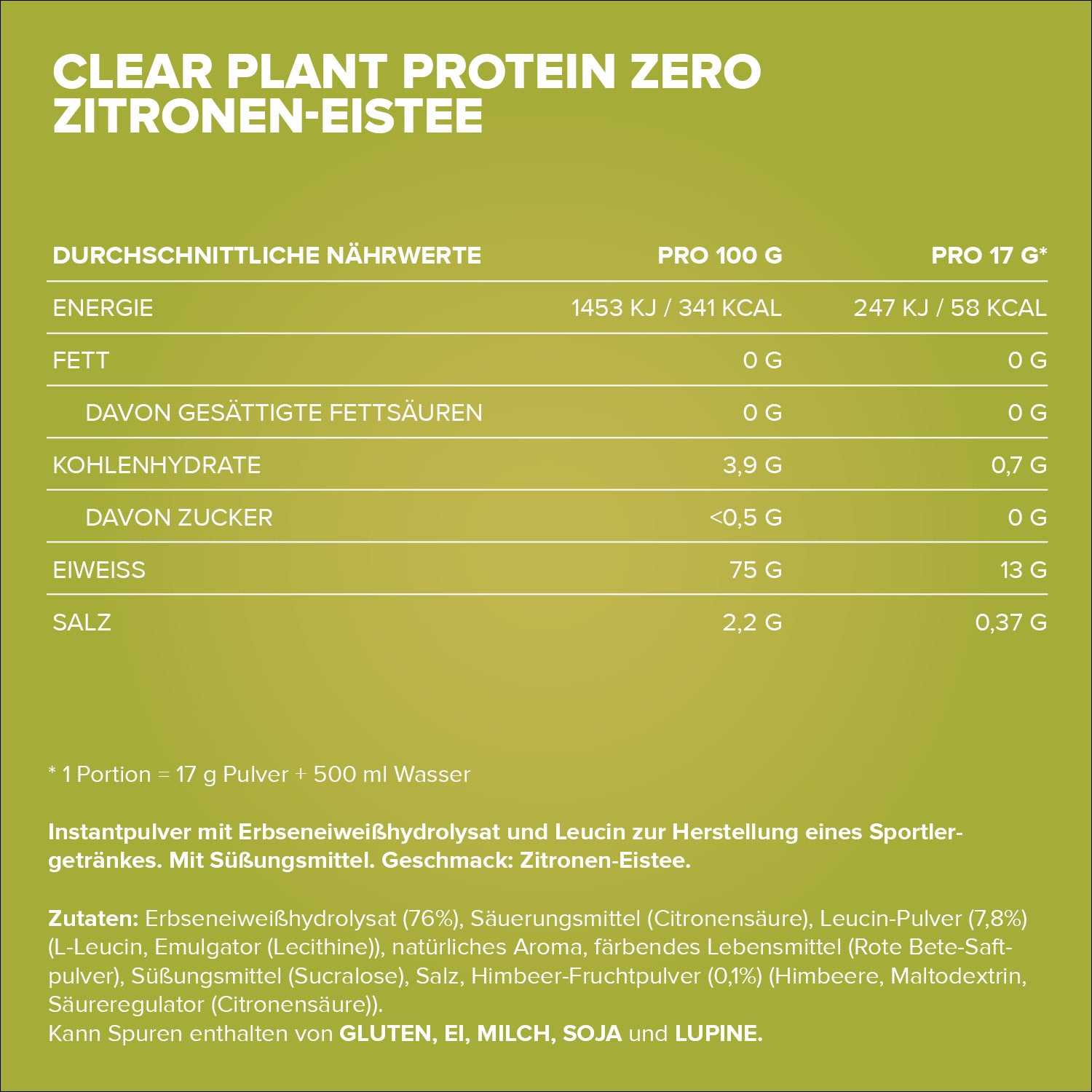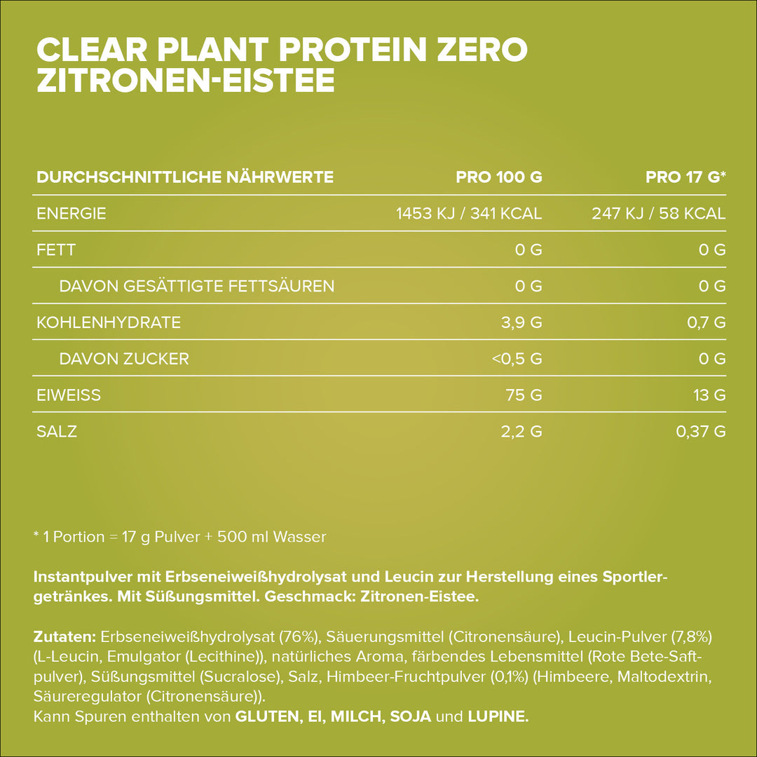 Erbseneiweißhydrolysat (82%), Säuerungsmittel (Citronensäure), Leucin-Pulver (7,8%) (L-Leucin, Emulgator (Lecithine)), natürliches Aroma, Salz, Süßungsmittel (Sucralose), Farbstoff (Ammoniumsulfit-Zuckerkulör), Zitronensaftpulver (0,1%) (Maltodextrin, Zitronensaftkonzentrat).