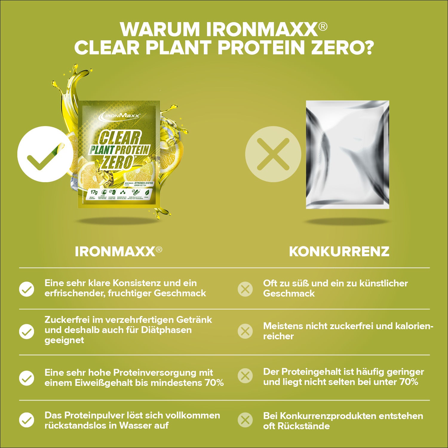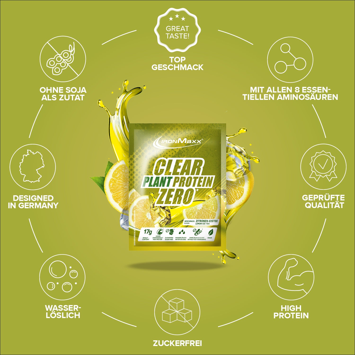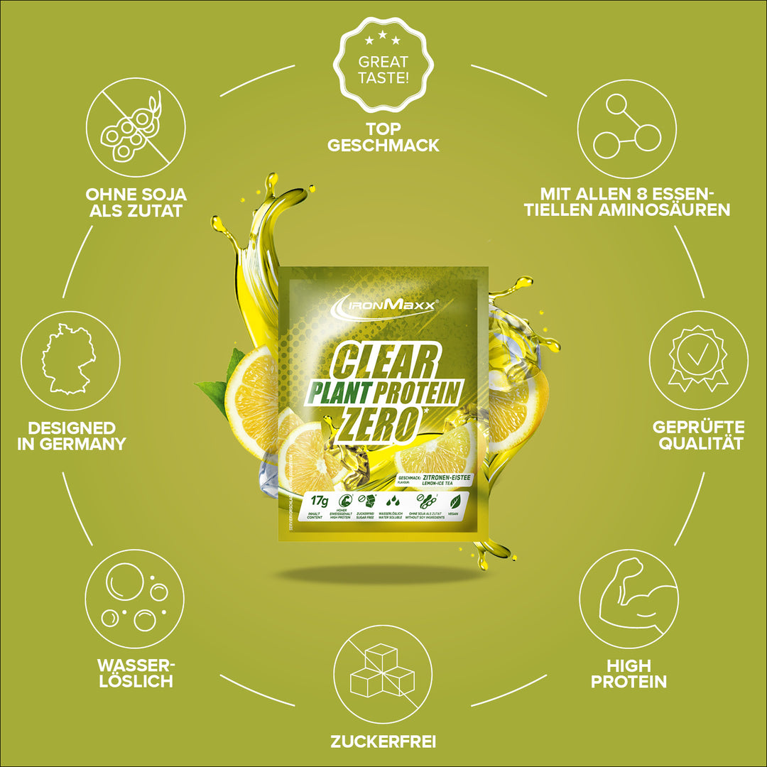 IronMaxx® Clear Plant Protein Lemon Ice Tea kombiniert pflanzliches Eiweiß mit fruchtigem Geschmack – ganz ohne dickflüssige Konsistenz. Mit bis zu 13 g Erbsenprotein-Hydrolysat pro Portion unterstützt es gezielt Muskelaufbau und Regeneration. Ideal für Training und aktiven Alltag – zuckerfrei, vegan und laktosefrei. Einfach mit Wasser mischen, shaken, fertig!