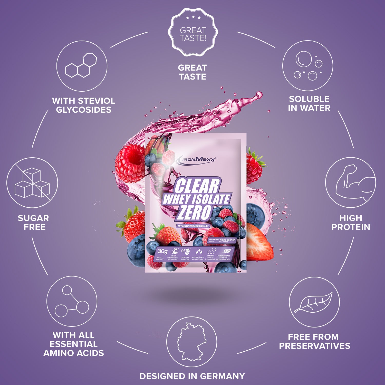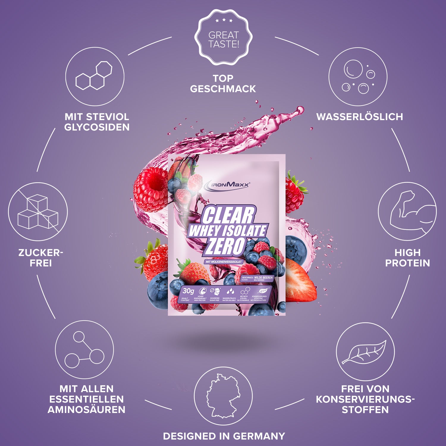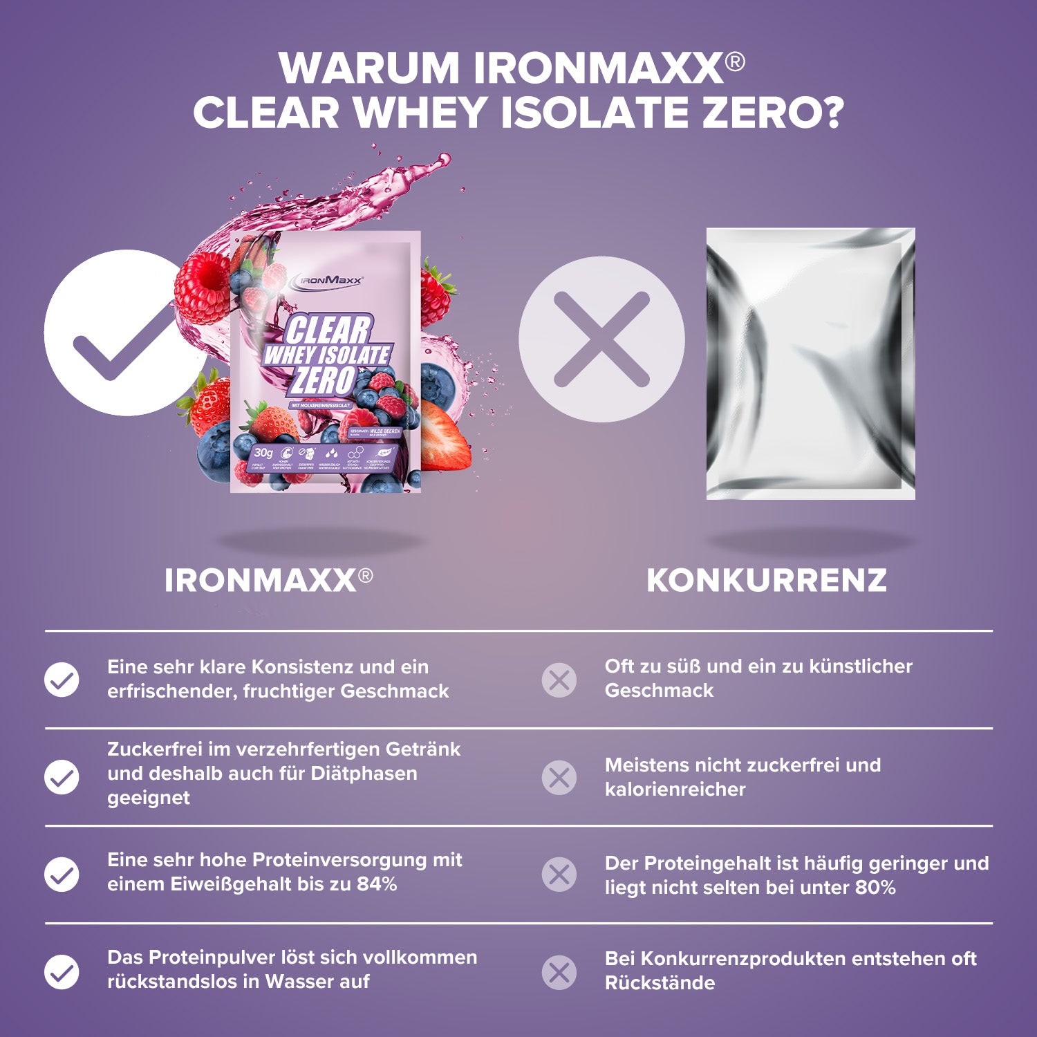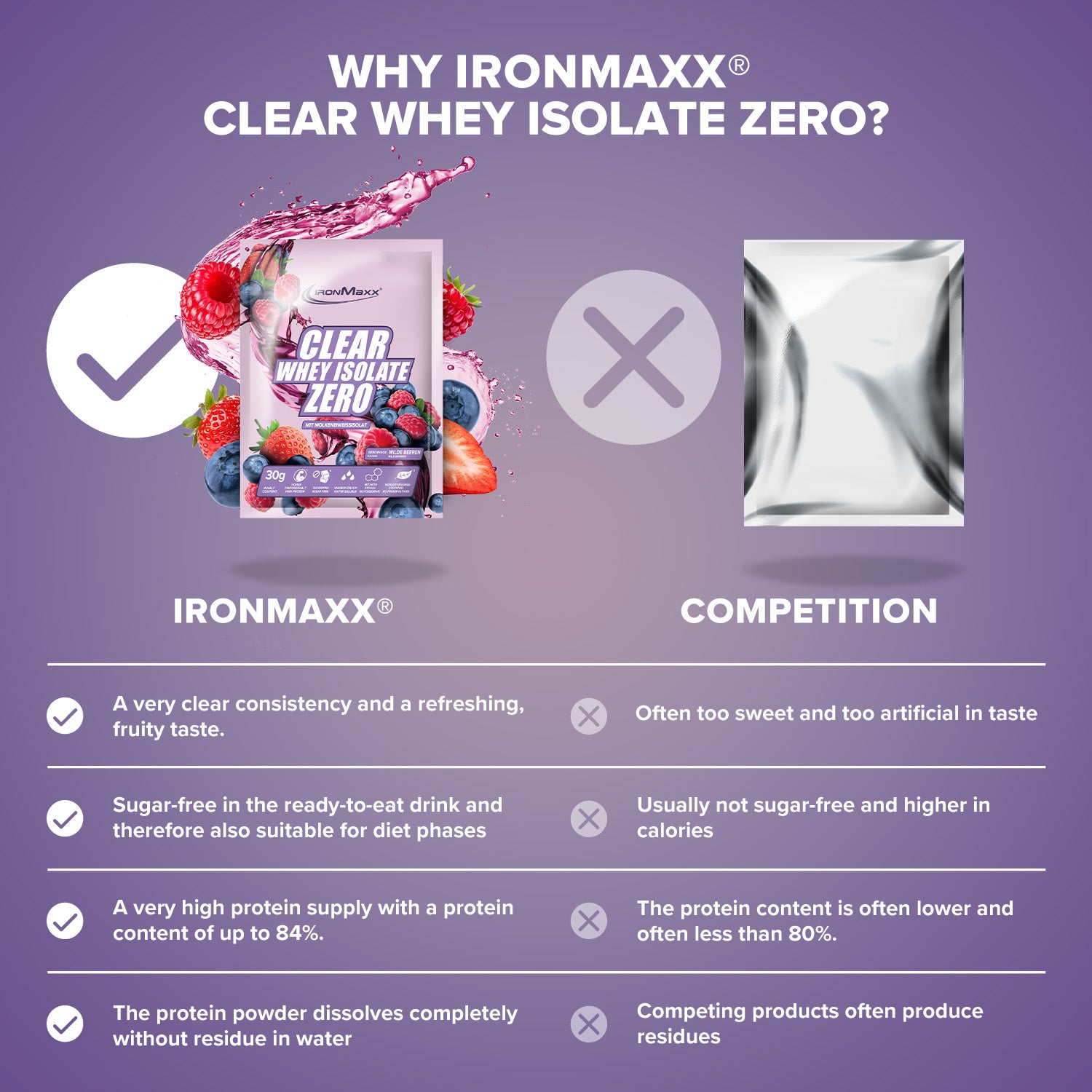 - Erfrischend & klar: Clear Whey Isolate Zero von IronMaxx® – das Proteinpulver mit fruchtig-leichtem Softdrink-Geschmack.