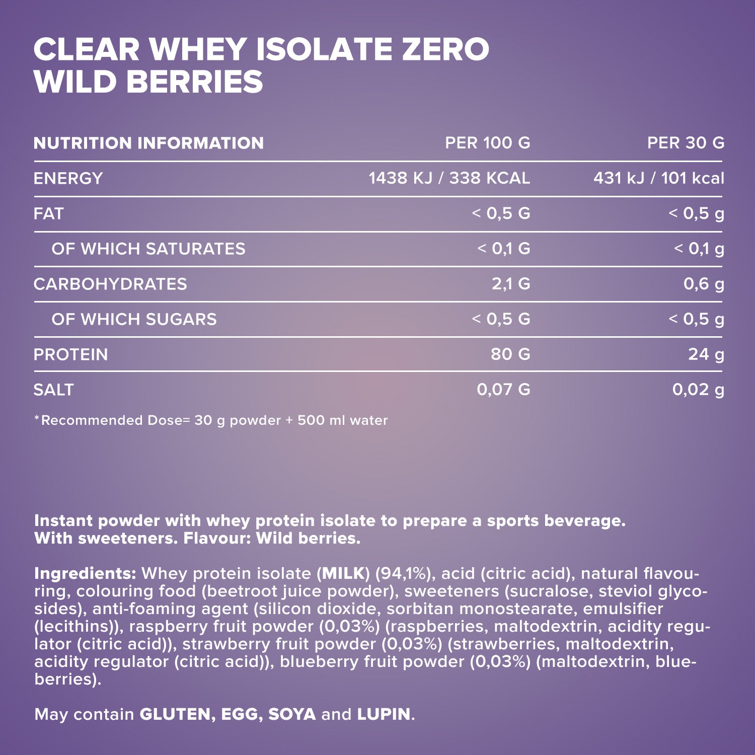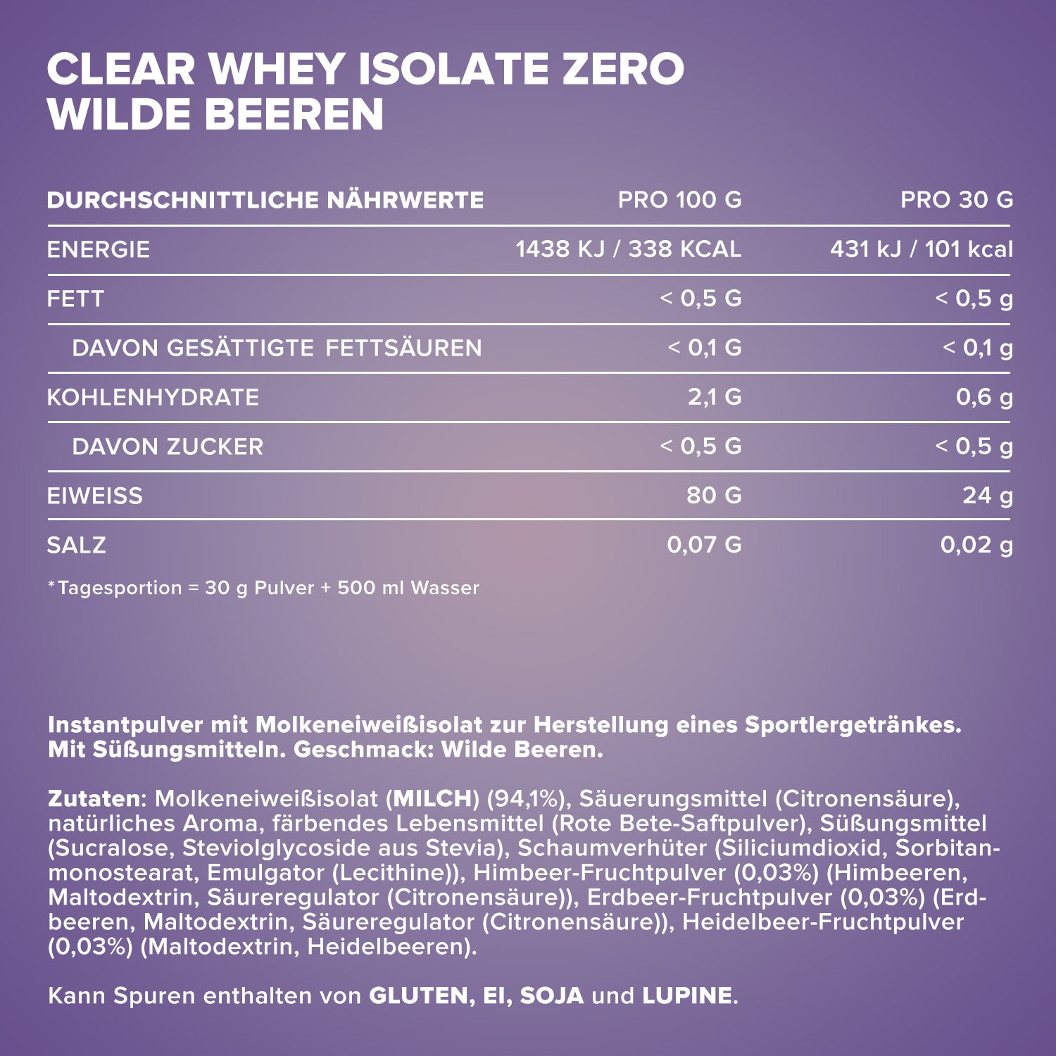 Molkeneiweißisolat (MILCH) (94,1%), Säuerungsmittel (Citronensäure), natürliches Aroma, färbendes Lebensmittel (Rote Bete-Saftpulver), Süßungsmittel (Sucralose, Steviolglycoside aus Stevia), Schaumverhüter (Siliciumdioxid, Sorbitanmonostearat, Emulgator (Lecithine)), Himbeer-Fruchtpulver (0,03%) (Himbeeren, Maltodextrin, Säureregulator (Citronensäure)), Erdbeer-Fruchtpulver (0,03%) (Erdbeeren, Maltodextrin, Säureregulator (Citronensäure)), Heidelbeer-Fruchtpulver (0,03%) (Maltodextrin, Heidelbeeren).