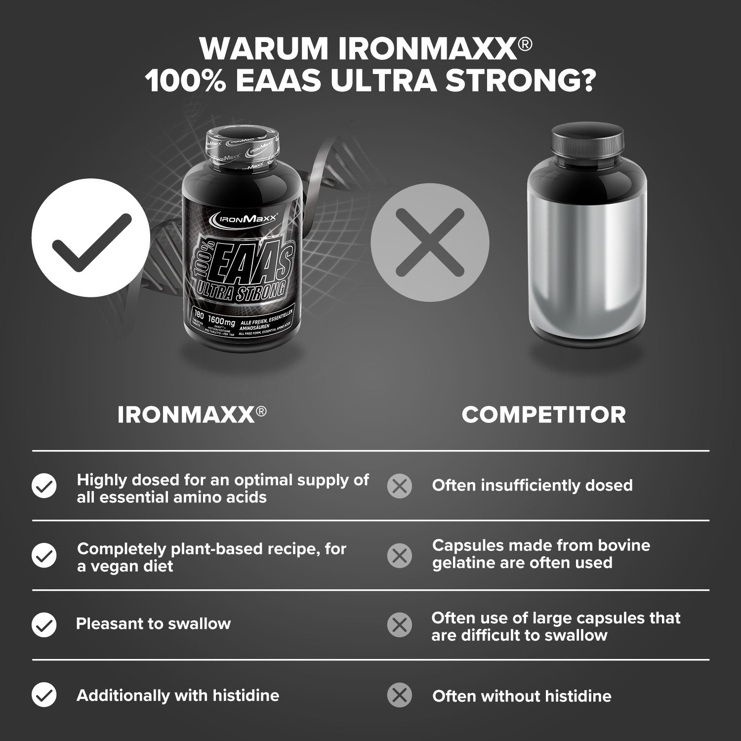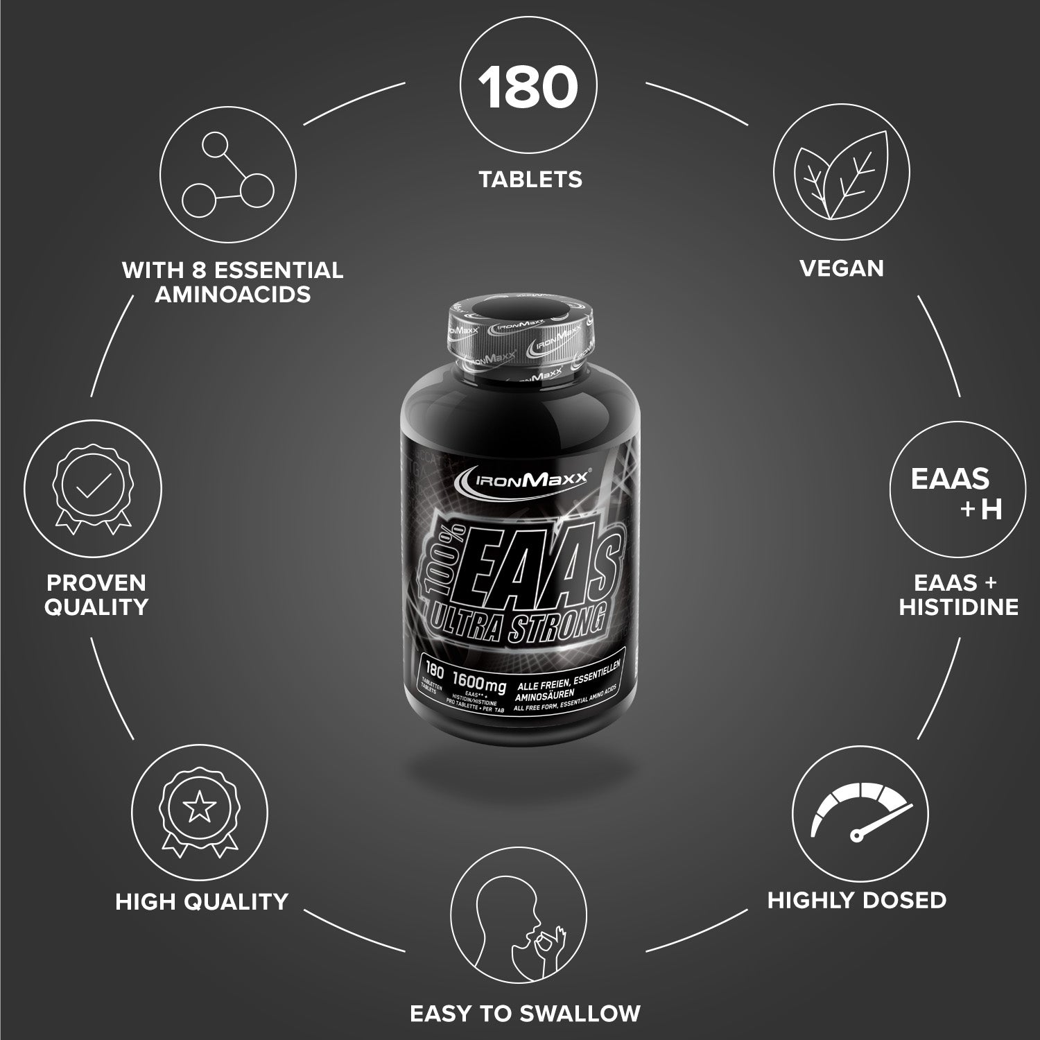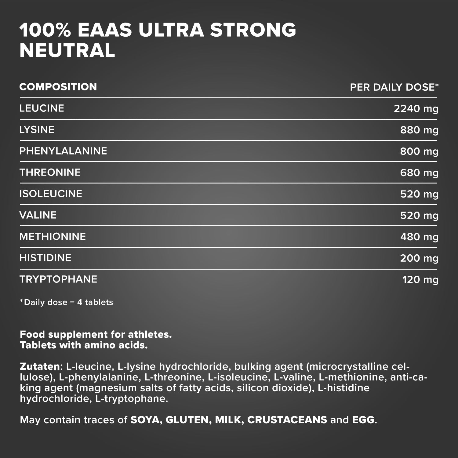 - Hochdosierte Formel: 1600 mg EAAs + Histidin pro Tablette für maximale Wirksamkeit