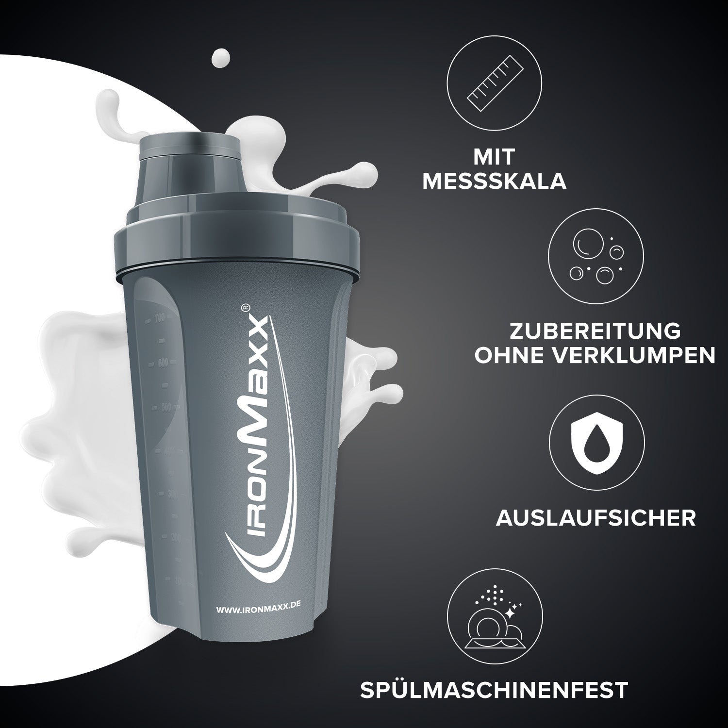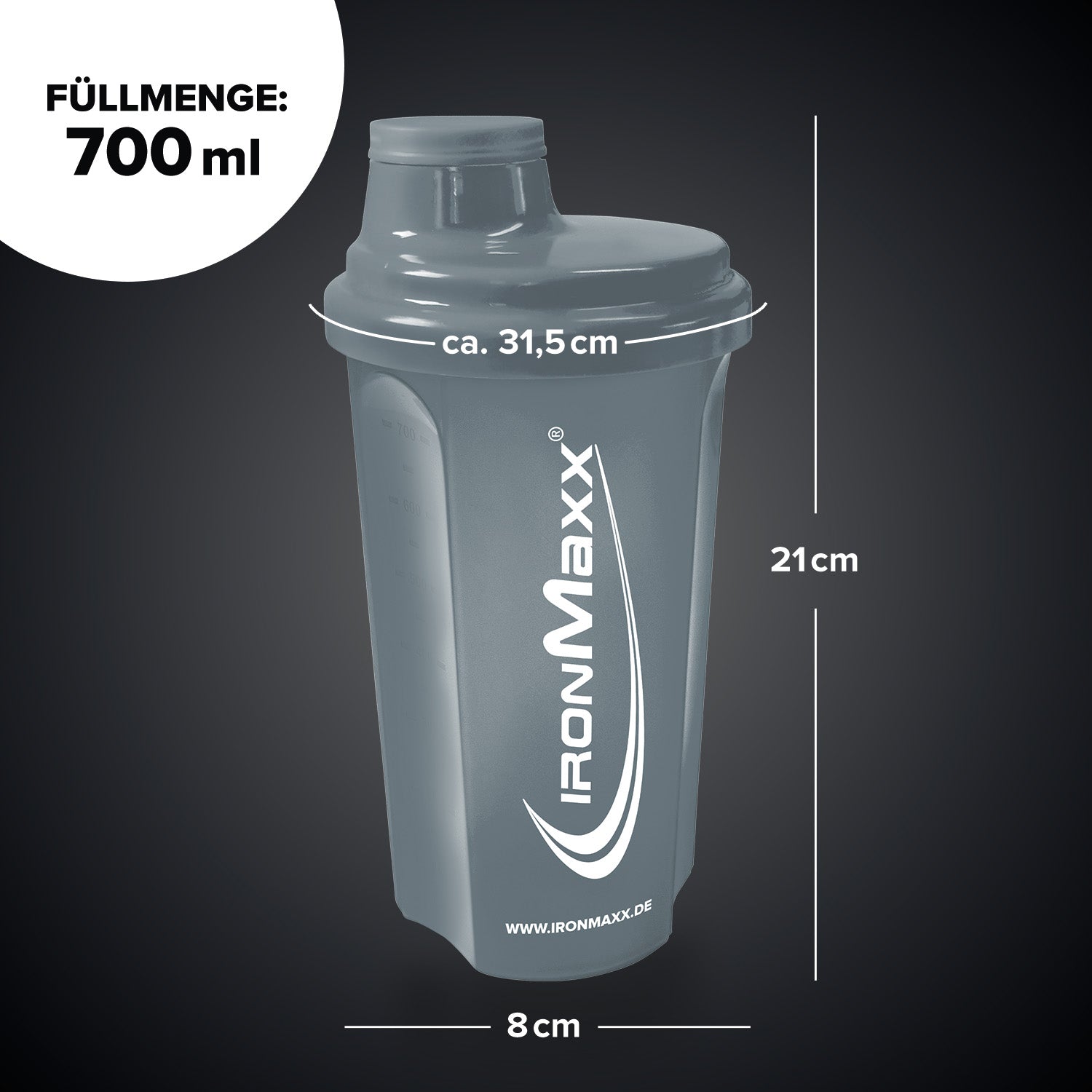 Der klassische IronMaxx® Protein Shaker ist dein verlässlicher Begleiter für cremige, klumpenfreie Shakes – überall und jederzeit. Mit einem Fassungsvermögen von 700 ml, integriertem Sieb und präziser Messskala gelingt dir jedes Mischverhältnis perfekt.