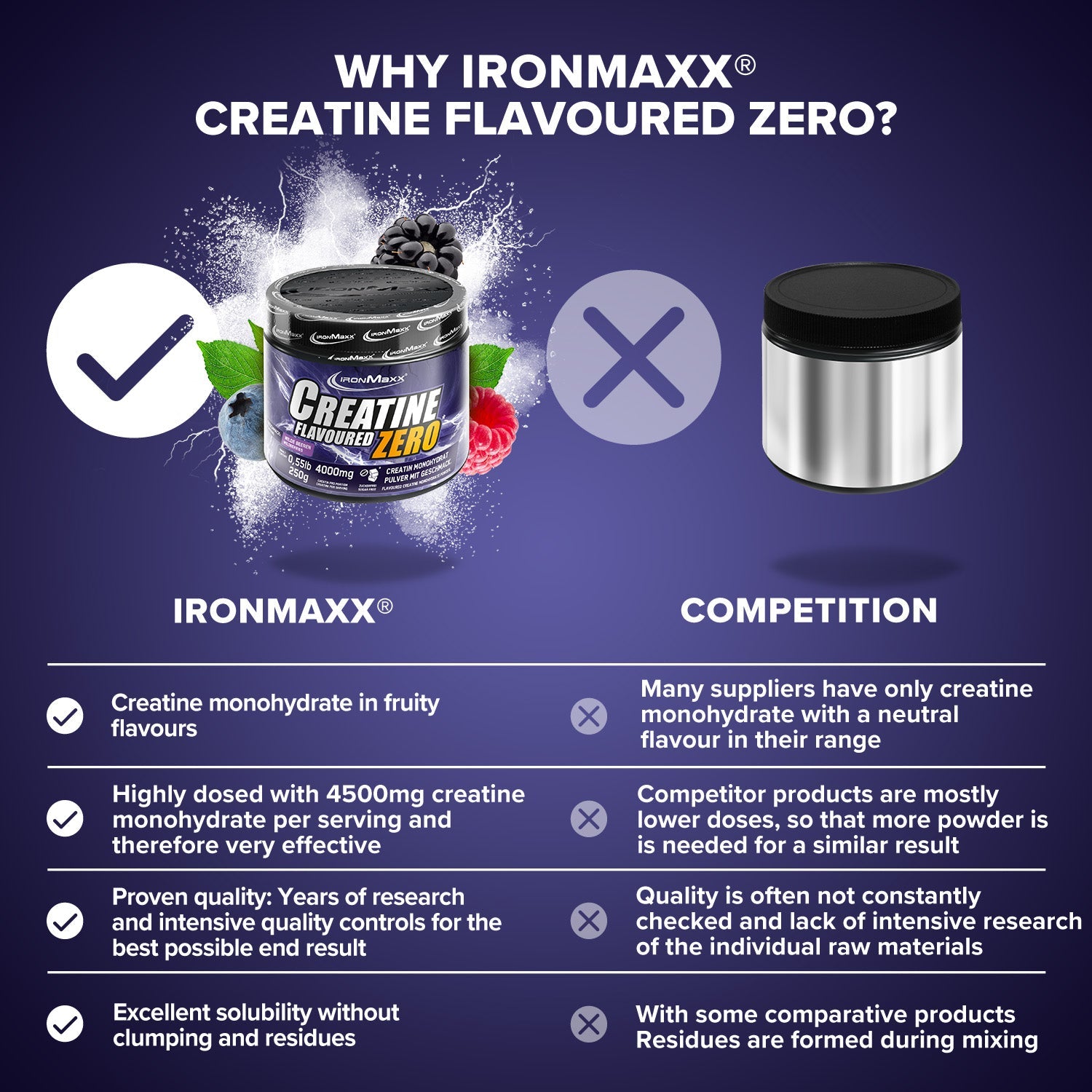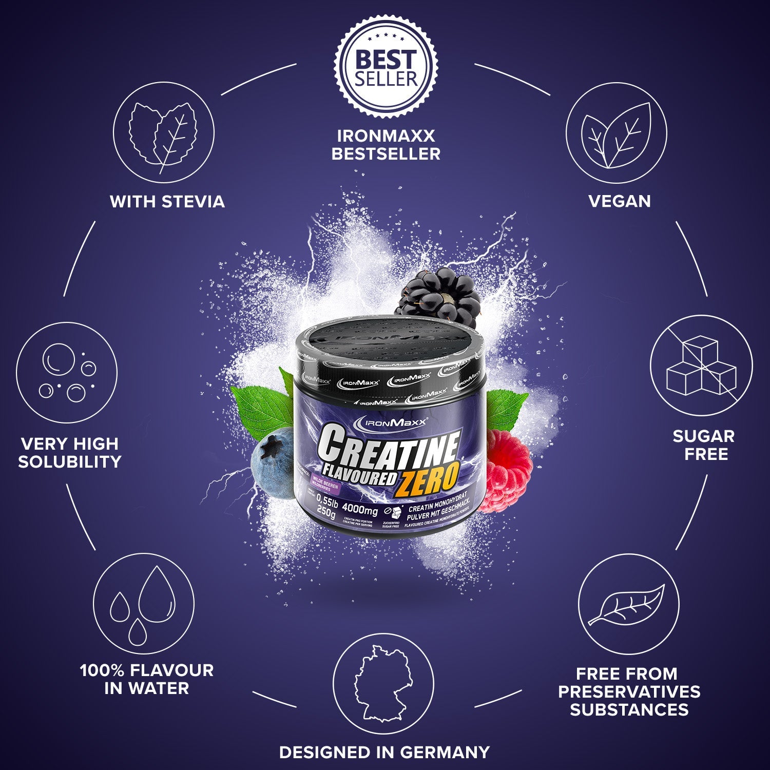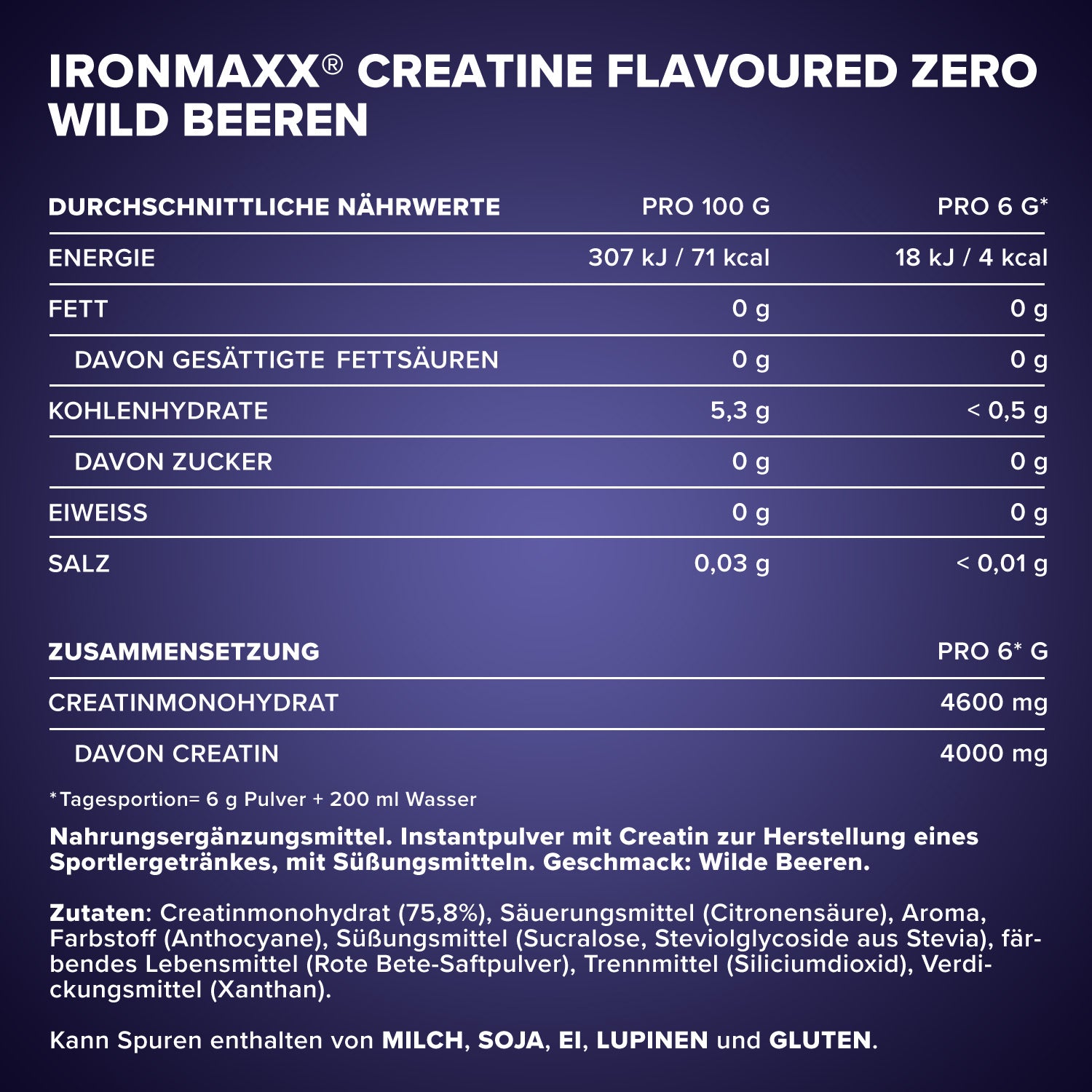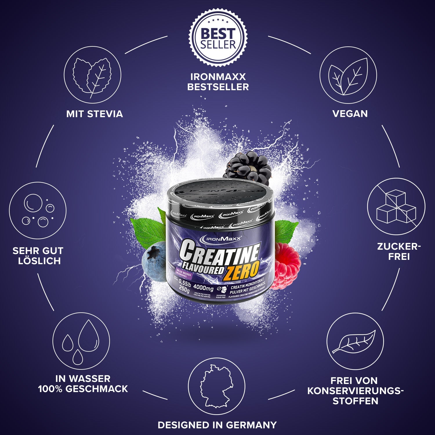 Du willst dein Training aufs nächste Level bringen – aber ohne langweiligen Geschmack? Dann ist das Creatine Flavoured Zero - Wildberries von IronMaxx® genau das Richtige für dich! Mit 4 g reinem Creatin pro Portion unterstützt es effektiv deine Schnellkraft und Performance bei kurzen, intensiven Belastungen. Das Beste: fruchtiger Geschmack, komplett zuckerfrei, ohne Farbstoffe und vegetarisch – ideal auch in Diätphasen.