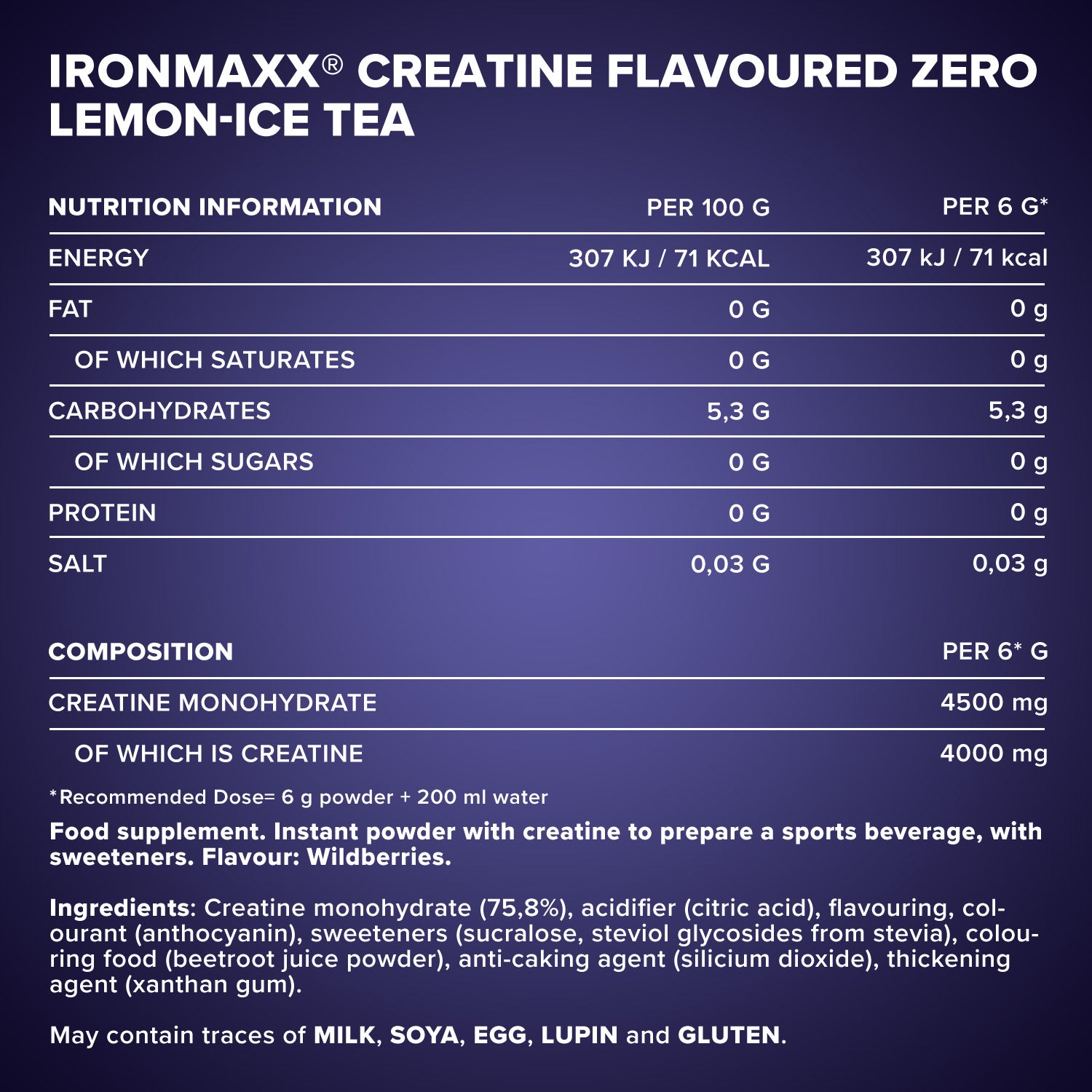 Creatinmonohydrat (75,8%), Säuerungsmittel (Citronensäure), Aroma, Farbstoff (Anthocyane), Süßungsmittel (Sucralose, Steviolglycoside aus Stevia), färbendes Lebensmittel (Rote Bete-Saftpulver), Trennmittel (Siliciumdioxid), Verdickungsmittel (Xanthan)