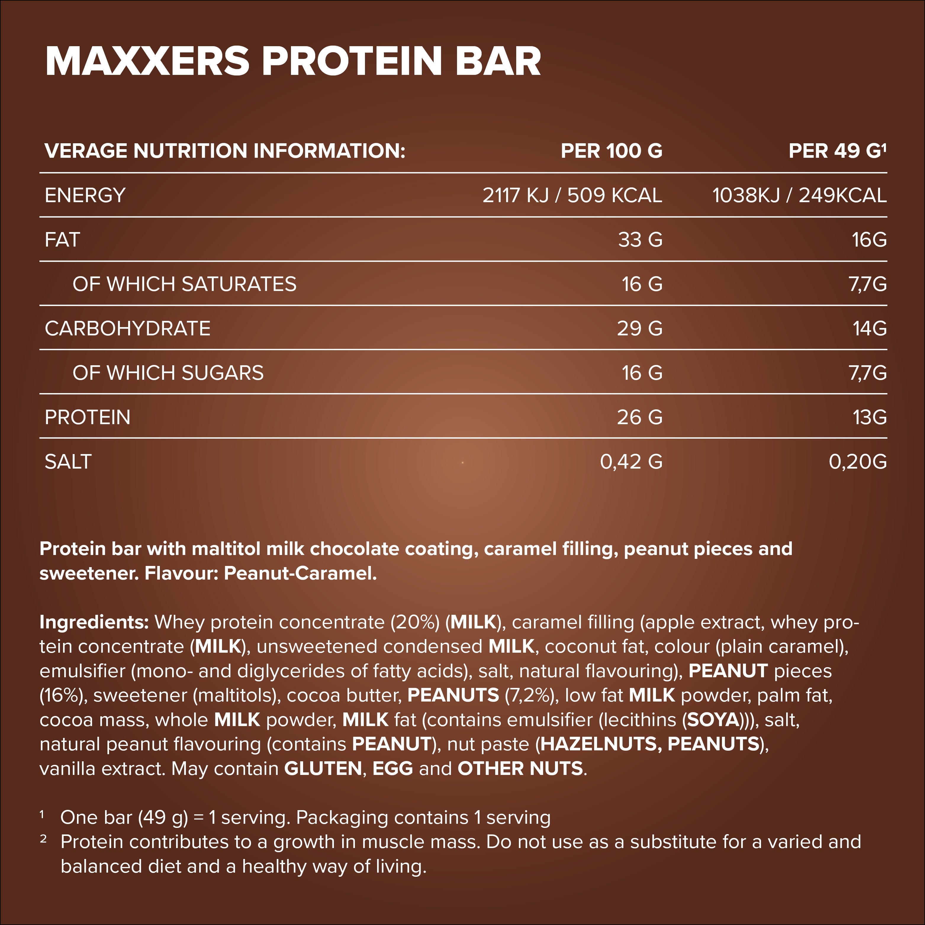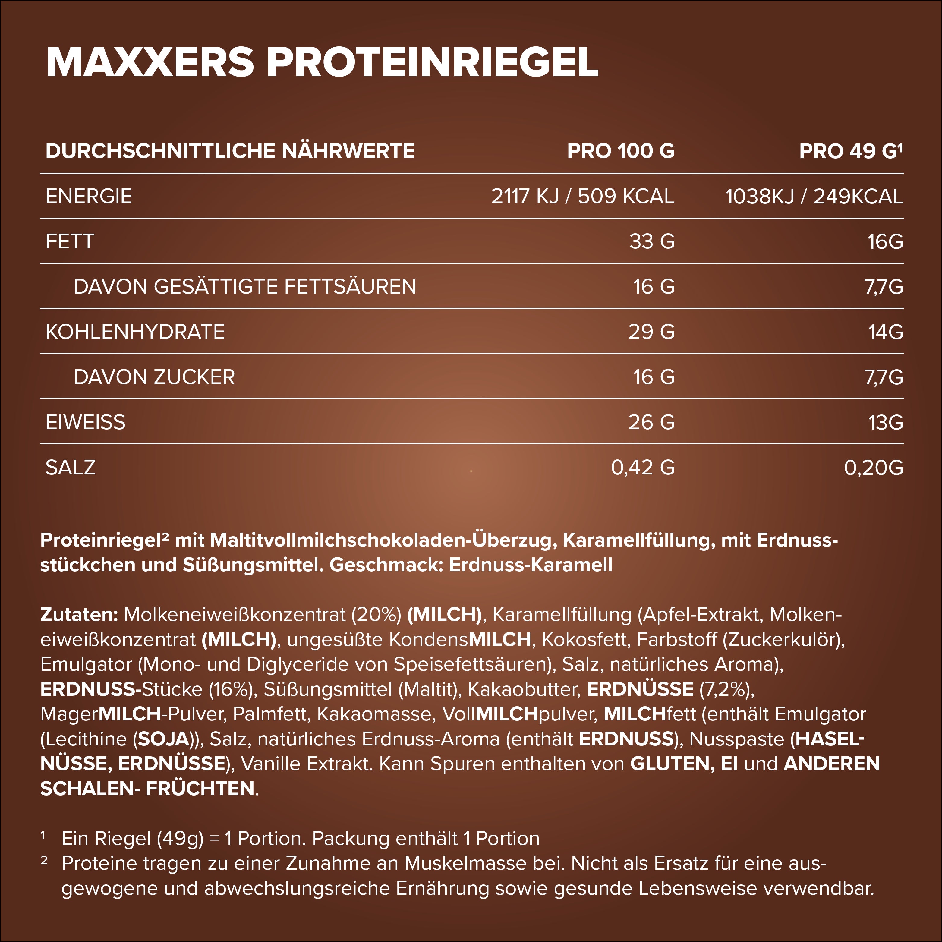 Molkeneiweißkonzentrat (20%) (MILCH), Karamellfüllung (ApfelExtrakt, Molkeneiweißkonzentrat (MILCH), ungesüßte KondensMILCH, Kokosfett, Farbstoff (Zuckerkulör), Emulgator (Mono- und Diglyceride von Speisefettsäuren), Salz, natürliches Aroma), ERDNUSSstücke (16%), Süßungsmittel (Maltit), Kakaobutter, ERDNÜSSE (7,2%), MagerMILCHpulver, Palmfett, Kakaomasse, VollMILCHpulver, MILCHfett (enthält Emulgator (Lecithine (SOJA))), Salz, natürliches Erdnuss-Aroma (enthält ERDNUSS), Nusspaste (HASELNÜSSE, ERDNÜSSE), Vanille-Extrakt. Kann Spuren enthalten von GLUTEN, EI und ANDEREN SCHALENFRÜCHTEN.