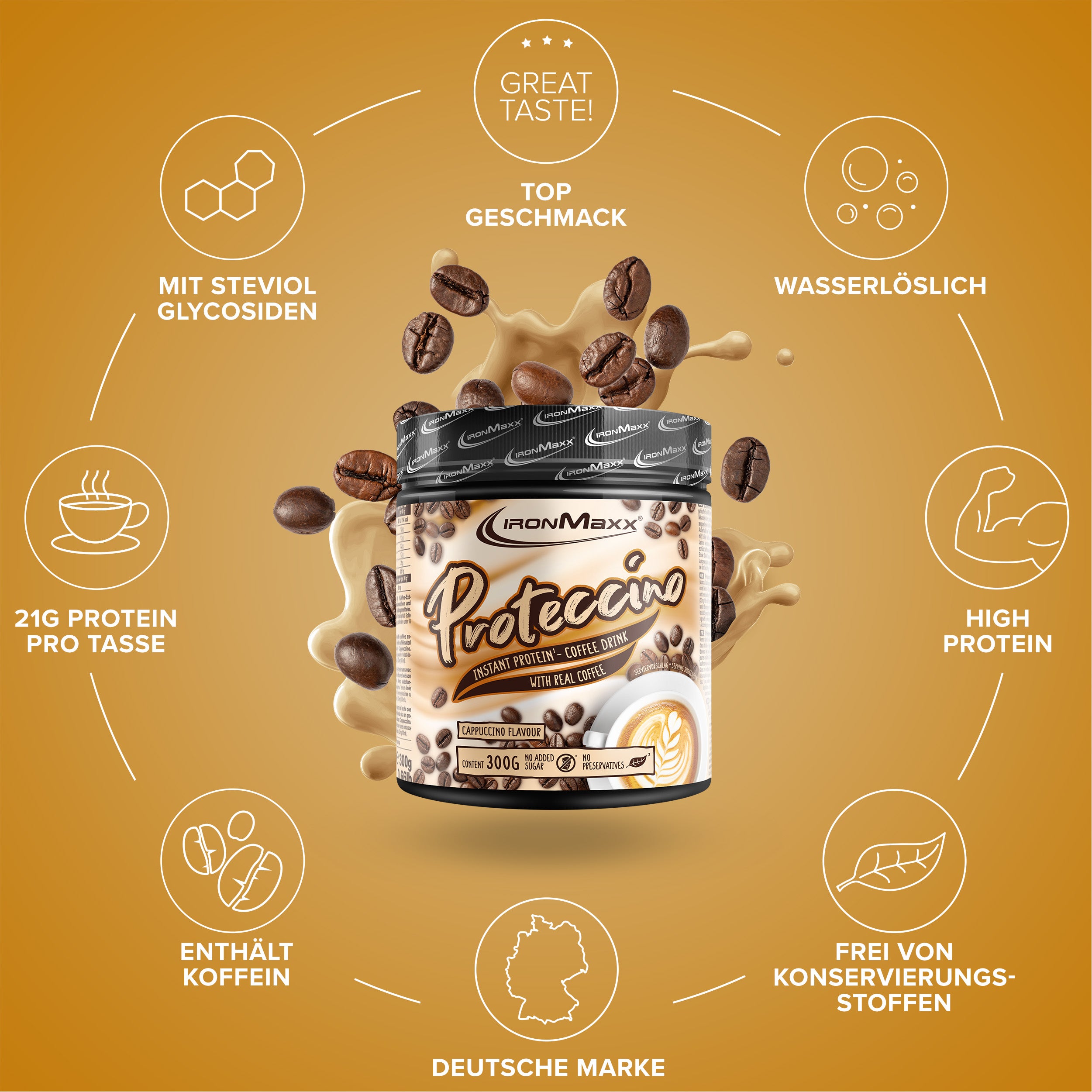 Kaffee oder Protein? Mit dem IronMaxx® Proteccino bekommst du beides – in einem cremigen Instant-Drink mit echtem Kaffee-Extrakt und bis zu 69 % Molkeneiweiß. Perfekt als Frühstücks-Booster, Pre-Workout-Drink oder proteinreicher Genussmoment.