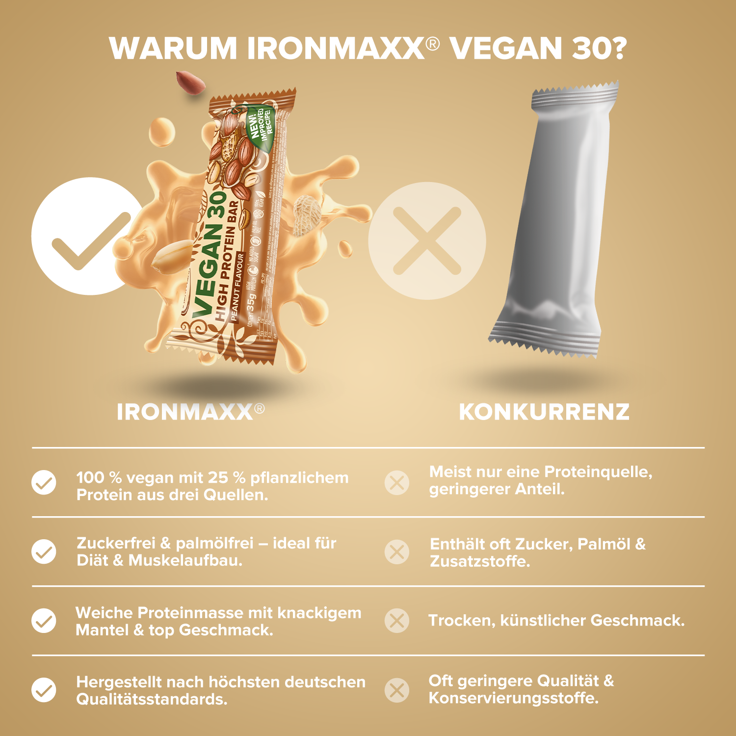 Der IronMaxx® Vegan 30 Proteinriegel ist dein perfekter Snack für unterwegs – jetzt mit noch besserem Geschmack und optimierter Konsistenz! Mit 25 % pflanzlichem Protein aus Erbsen-, Ackerbohnen- und Rapssamenprotein unterstützt er dich zuverlässig beim Muskelaufbau und in Diätphasen.