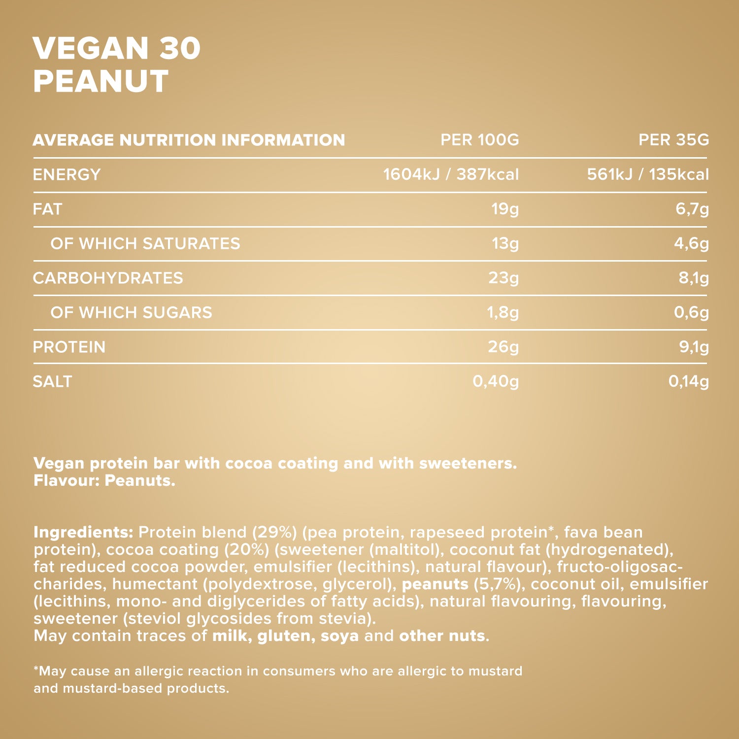 Eiweißmischung (29%) (Erbseneiweiß, Rapssameneiweiß*, Ackerbohneneiweiß), Kakaoüberzug (20%) (Süßungsmittel (Maltit), Kokosfett (gehärtet), stark entöltes Kakaopulver, Emulgator (Lecithine), natürliches Aroma), Fructooligosaccharide, Feuchthaltemittel (Polydextrose, Glycerin), ERDNÜSSE (5,7%), Kokosöl, Emulgator (Lecithine, Mono- und Diglyceride von Speisefettsäuren), natürliches Aroma, Aroma, Süßungsmittel (Steviolglycoside aus Stevia).