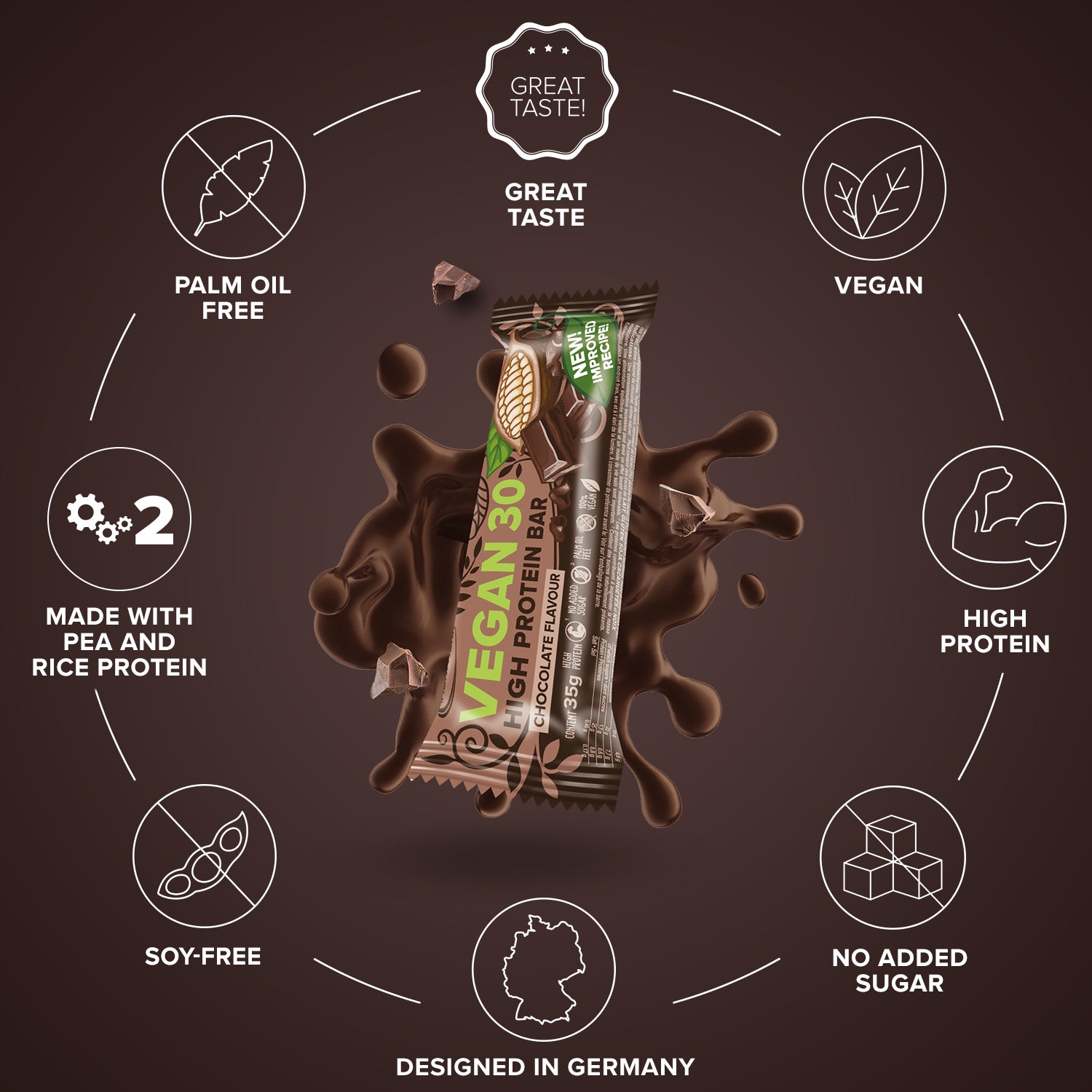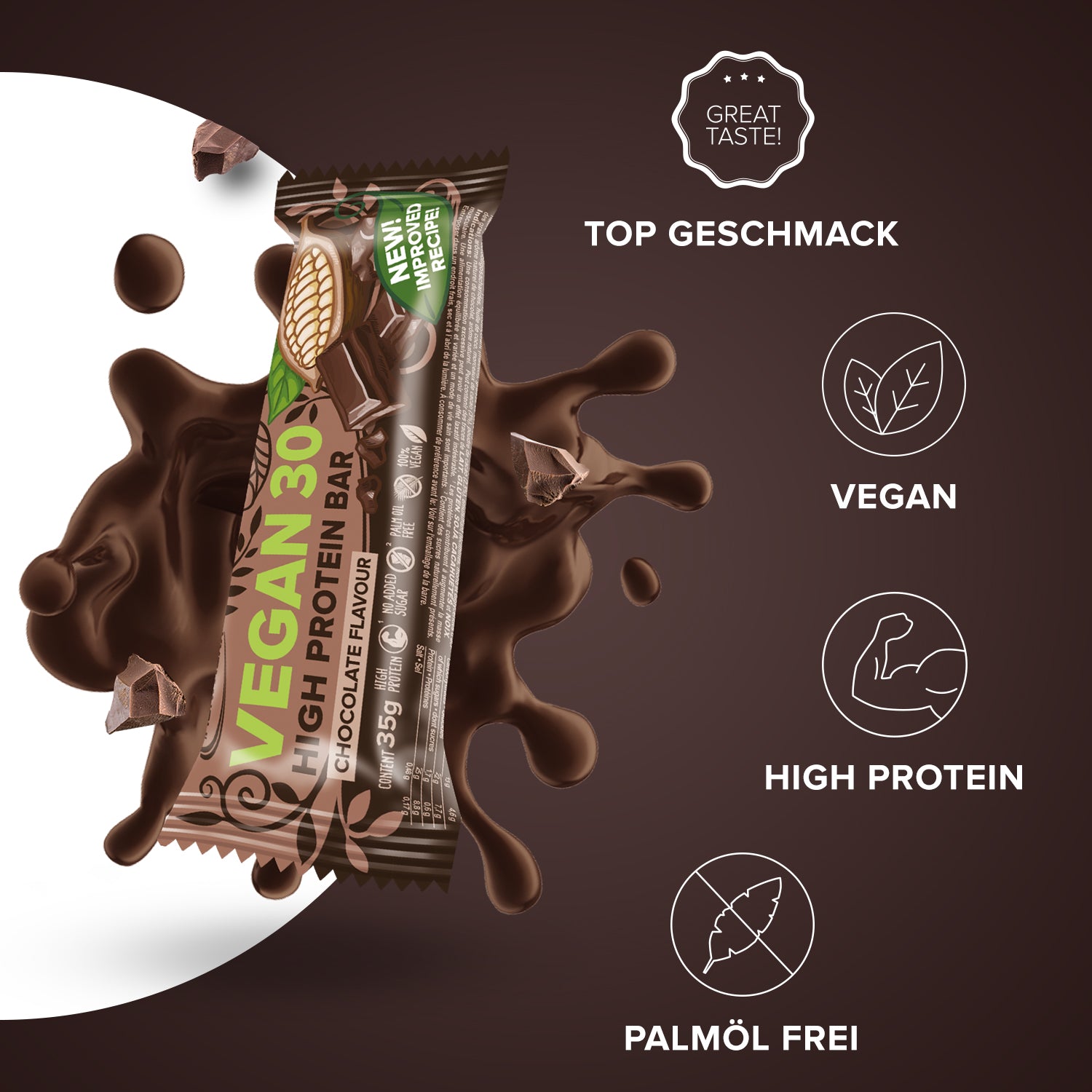 - Veganer Proteinriegel mit verbesserter Rezeptur & Konsistenz.