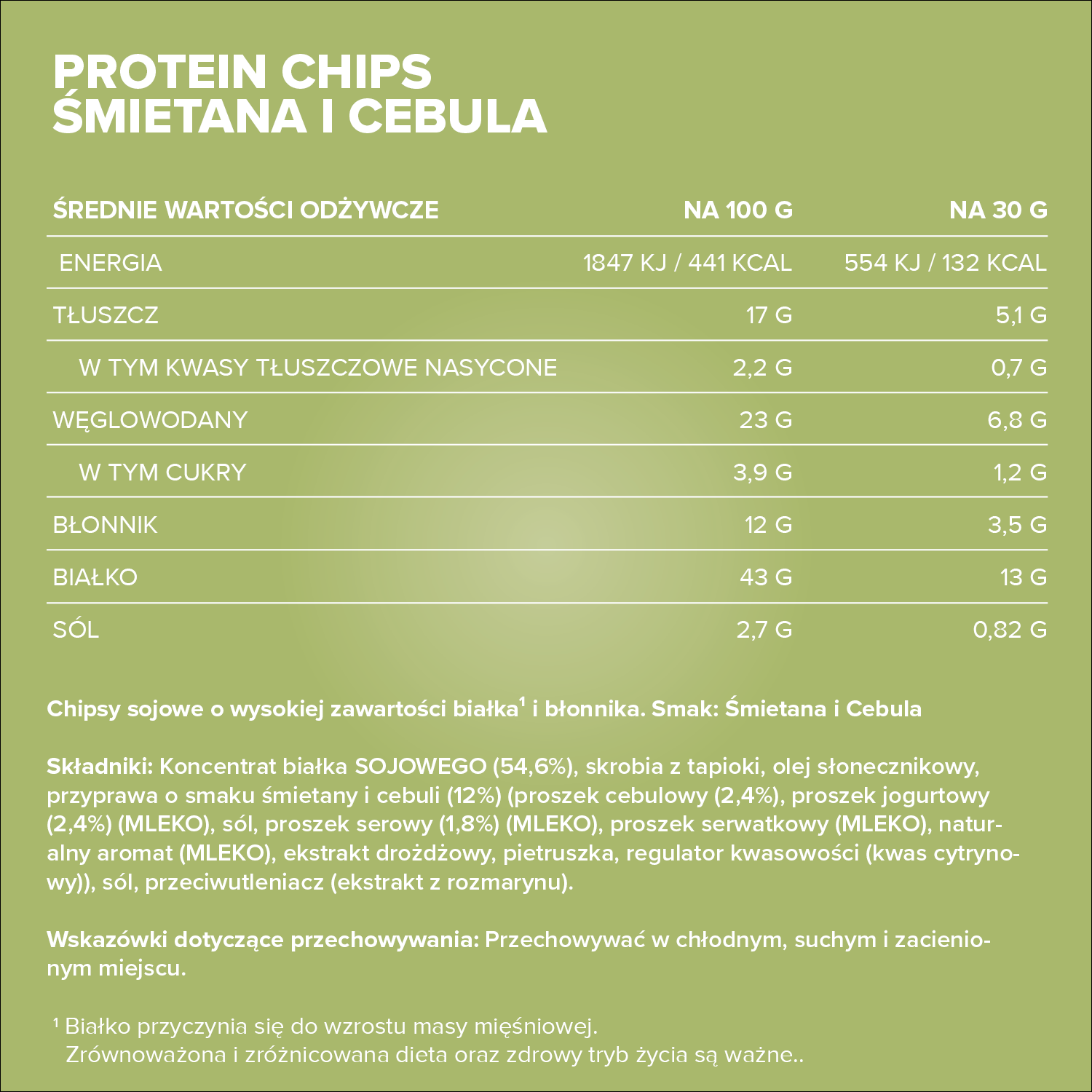 SOJAeiweißkonzentrat (54,6%), Tapiokastärke, Sonnenblumenöl, Saure Sahne-Zwiebel-Würzmischung (12%) (Zwiebelpulver (2,4%), Joghurtpulver (2,4%) (MILCH), Salz, Käsepulver (1,8%) (MILCH), Molkenpulver (MILCH), natürliches Aroma (MILCH), Hefe-Extrakt, Petersilie, Säuerungsmittel (Citronensäure)), Salz. Antioxidationsmittel (Rosmarin-Extrakt).
