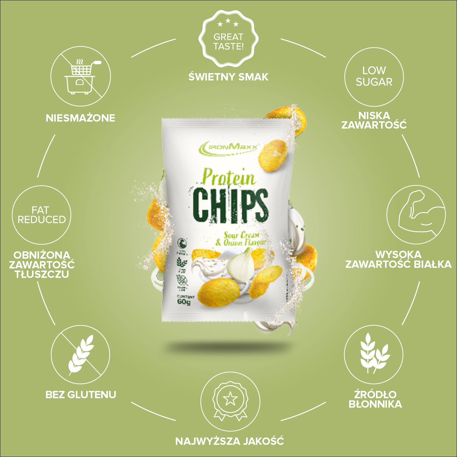 - High Protein Chips: Die IronMaxx® Protein Chips sind der perfekte Snack für Fitnessfans – proteinreich, kalorienarm und ideal für den Muskelaufbau.