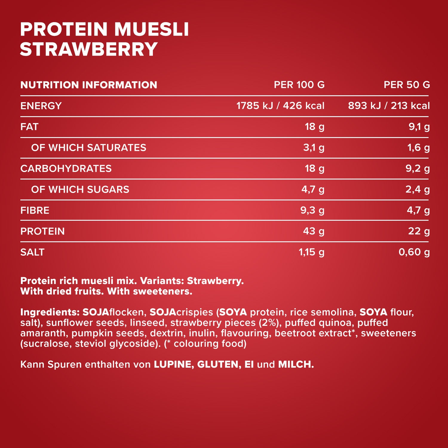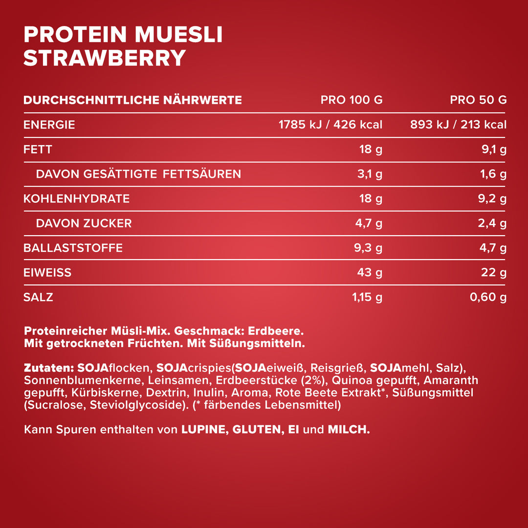 SOJAflocken, SOJAcrispies (SOJAeiweiß, Reisgrieß, SOJAmehl, Salz), Sonnenblumenkerne, Leinsamen, Erdbeerstücke (2%), Quinoa gepufft, Amaranth gepufft, Kürbiskerne, Dextrin, Inulin, Aroma, Rote Beete Extrakt*, Süßungsmittel (Sucralose, Steviolglycoside). (*färbendes Lebensmittel).