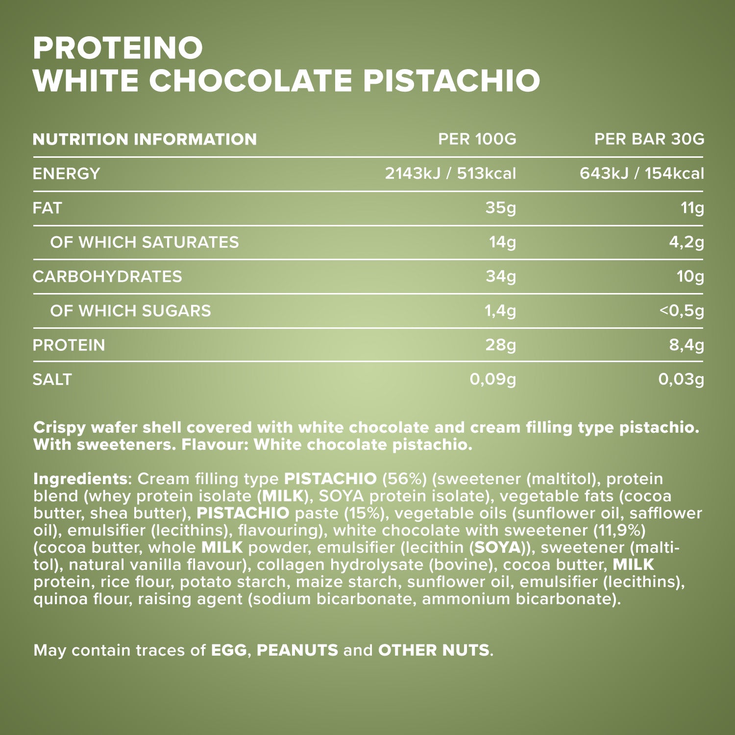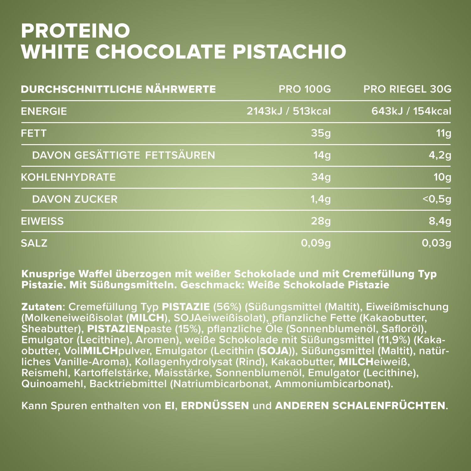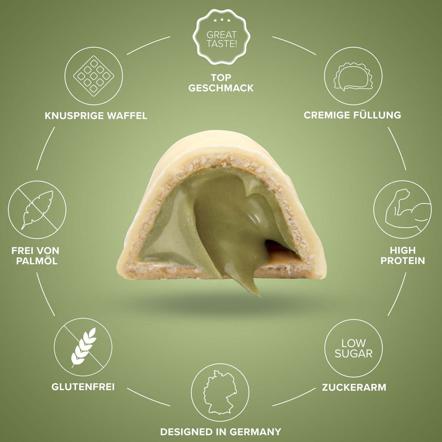Cremefüllung Typ PISTAZIE (56%) (Süßungsmittel (Maltit), Eiweißmischung (Molkeneiweißisolat (MILCH), SOJAeiweißisolat), pflanzliche Fette (Kakaobutter, Sheabutter), PISTAZIENpaste (15%), pflanzliche Öle (Sonnenblumenöl, Safloröl), Emulgator (Lecithine), Aromen), weiße Schokolade mit Süßungsmittel (11,9%) (Kakaobutter, VollMILCHpulver, Emulgator (Lecithin (SOJA)), Süßungsmittel (Maltit), natürliches Vanille-Aroma), Kollagenhydrolysat (Rind), Kakaobutter, MILCHeiweiß, Reismehl, Kartoffelstärke, Maisstärke, Sonnenblumenöl, Emulgator (Lecithine), Quinoamehl, Backtriebmittel (Natriumbicarbonat, Ammoniumbicarbonat).
