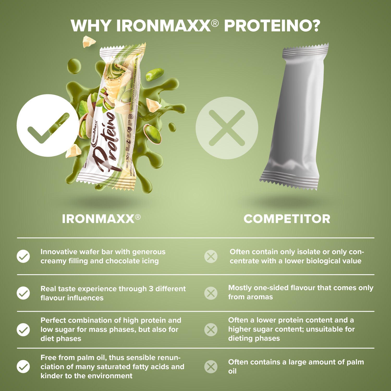 Der Proteino® von IronMaxx® ist der Proteinriegel, auf den Schoko-Fans gewartet haben: Knusprige Waffel, zart-cremige Füllung und ein feiner Schokoladenüberzug machen ihn zum echten Highlight – bei weniger als 1,5 g Zucker pro Riegel.