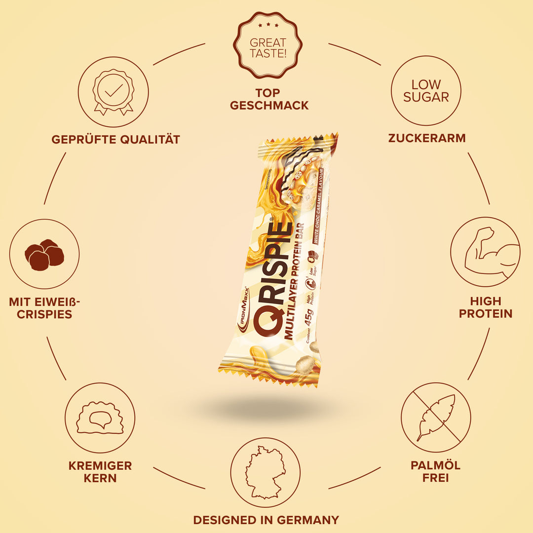 IronMaxx® Qrispie ist ein mehrschichtiger Proteinriegel, der knusprige Crispies mit einer cremigen Füllung kombiniert und so für ein intensives Snack-Erlebnis sorgt. Mit 33 g Eiweiß pro 100 g liefert Qrispie hochwertiges Eiweiß und eignet sich ideal für alle, die Genuss und Funktionalität verbinden möchten.