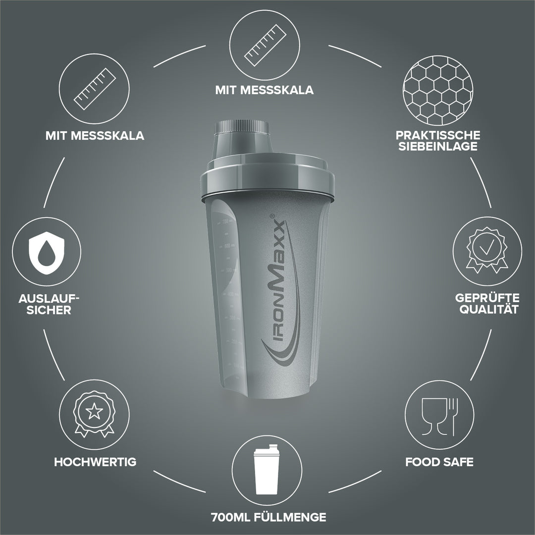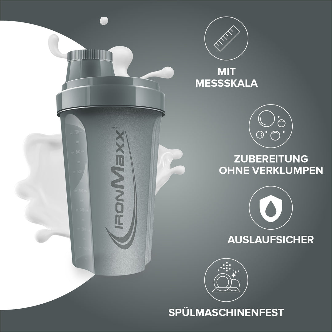 Der klassische IronMaxx® Protein Shaker ist dein verlässlicher Begleiter für cremige, klumpenfreie Shakes – überall und jederzeit. Mit einem Fassungsvermögen von 700 ml, integriertem Sieb und präziser Messskala gelingt dir jedes Mischverhältnis perfekt.