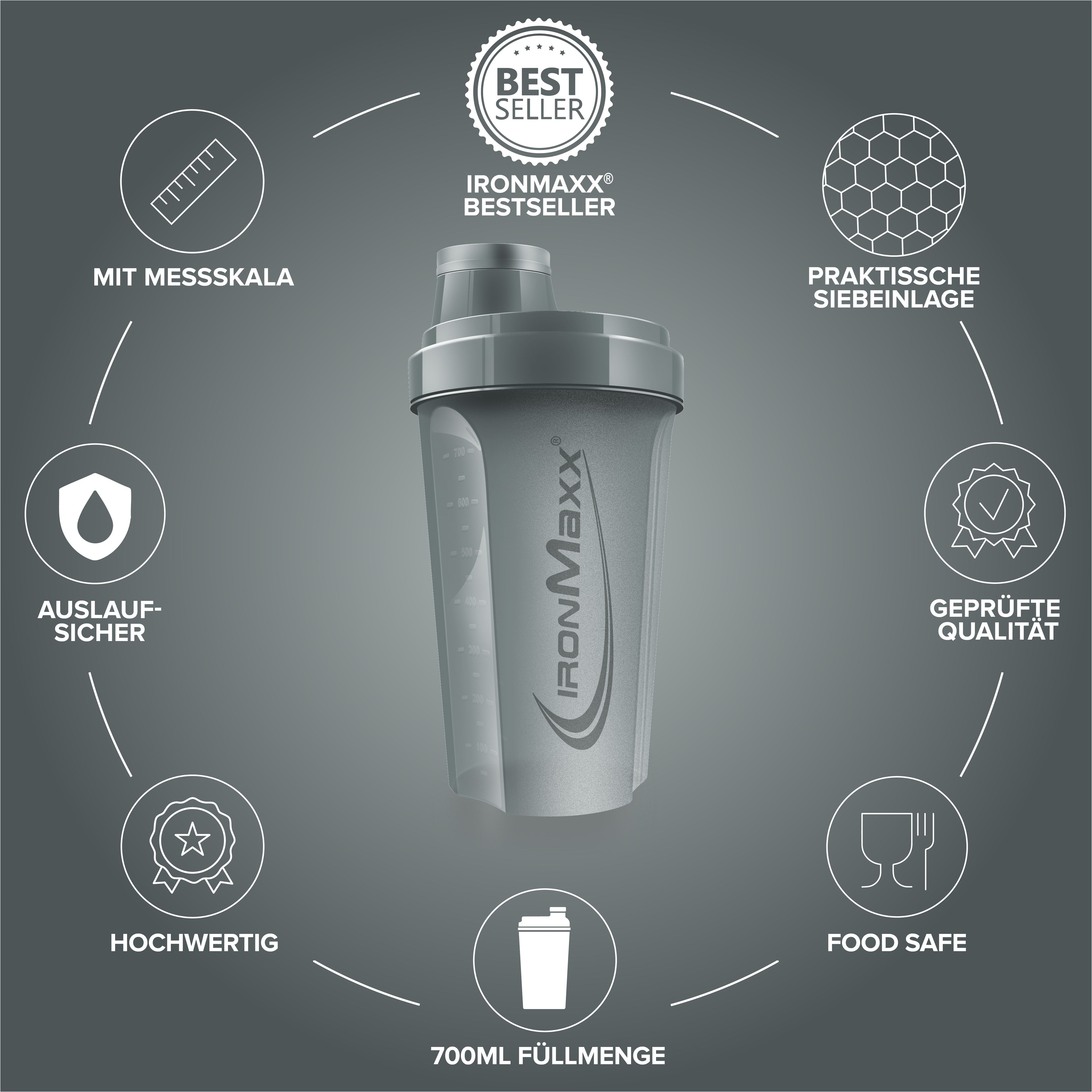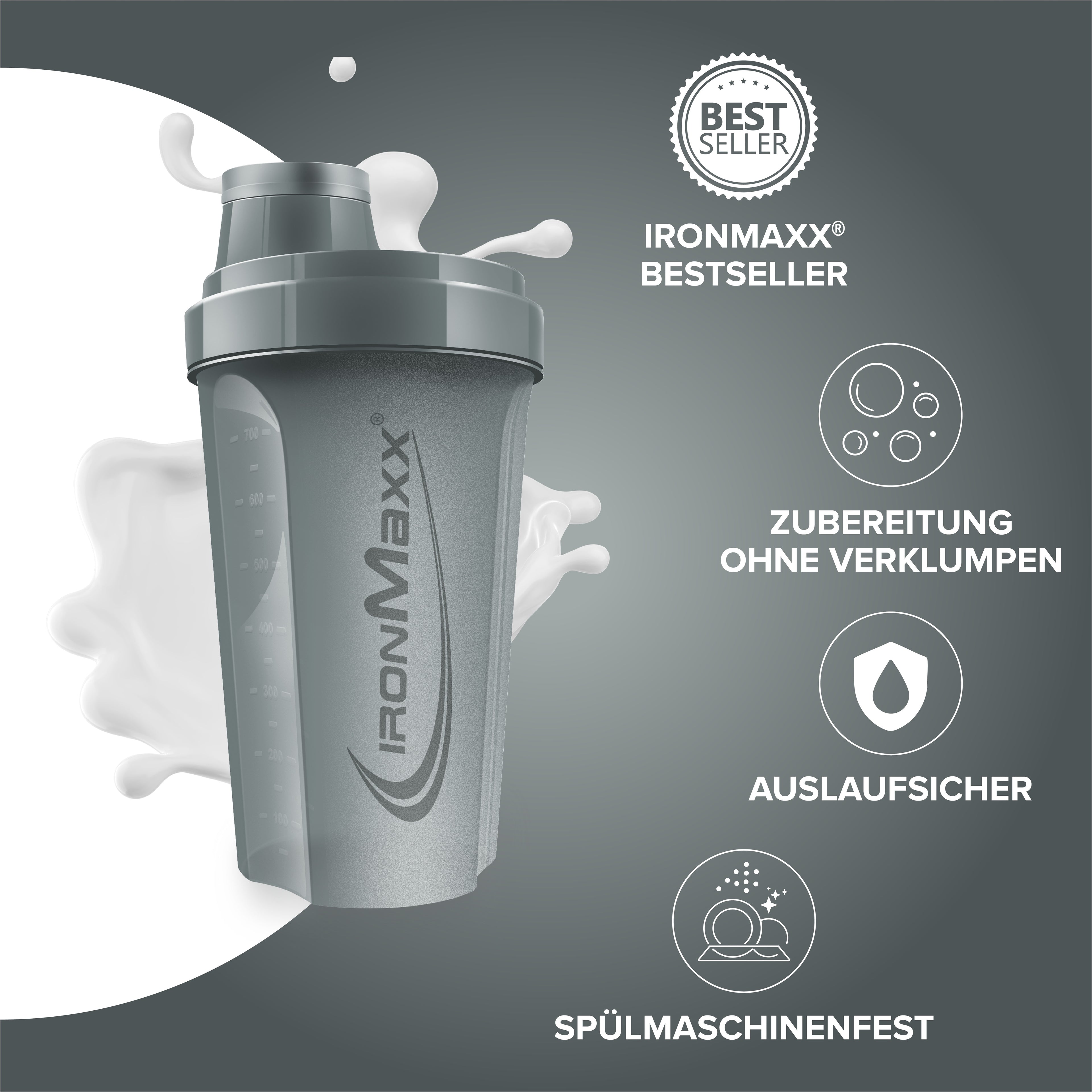 Der klassische IronMaxx® Protein Shaker ist dein verlässlicher Begleiter für cremige, klumpenfreie Shakes – überall und jederzeit. Mit einem Fassungsvermögen von 700 ml, integriertem Sieb und präziser Messskala gelingt dir jedes Mischverhältnis perfekt.