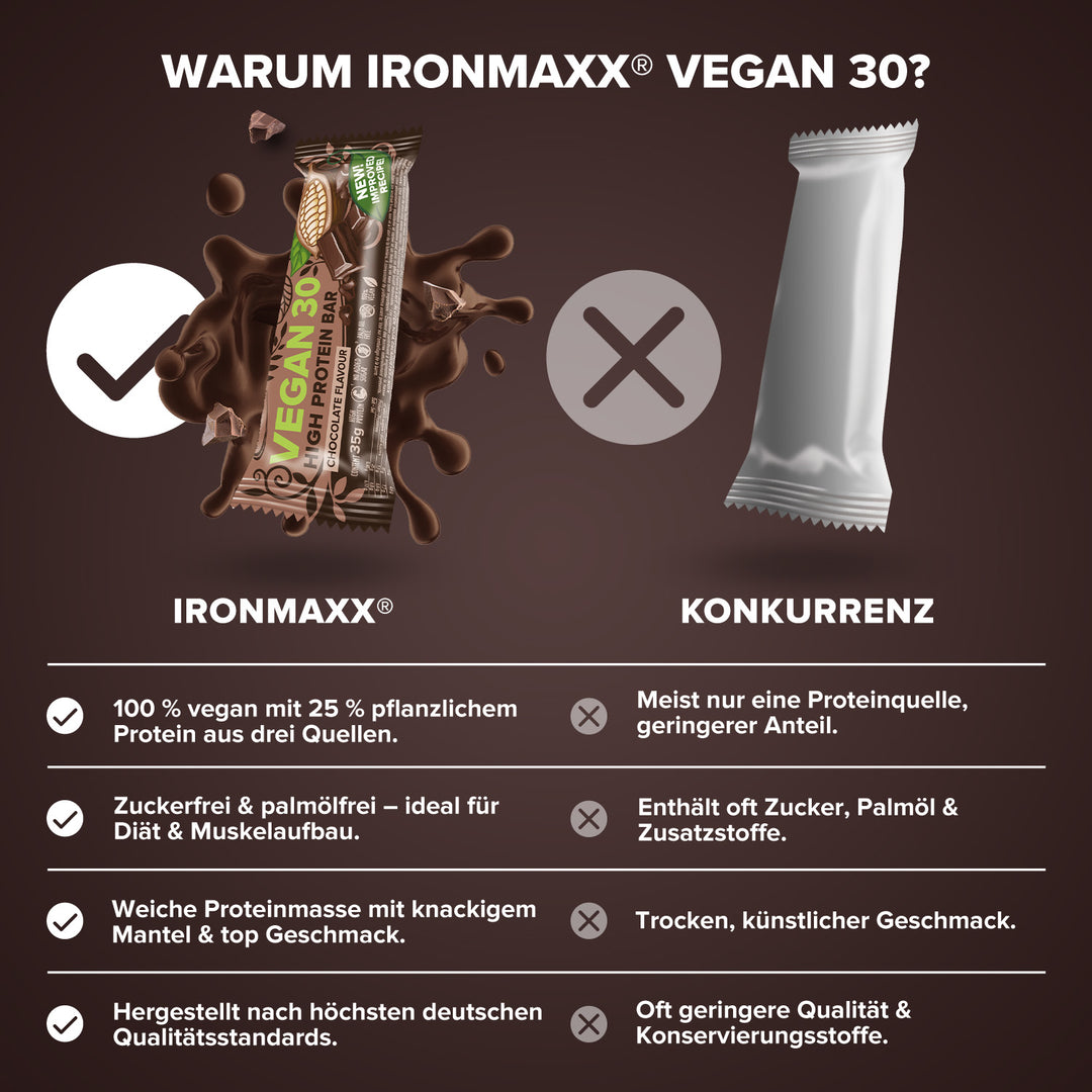 Der IronMaxx® Vegan 30 Proteinriegel ist dein perfekter Snack für unterwegs – jetzt mit noch besserem Geschmack und optimierter Konsistenz! Mit 25 % pflanzlichem Protein aus Erbsen-, Ackerbohnen- und Rapssamenprotein unterstützt er dich zuverlässig beim Muskelaufbau und in Diätphasen.