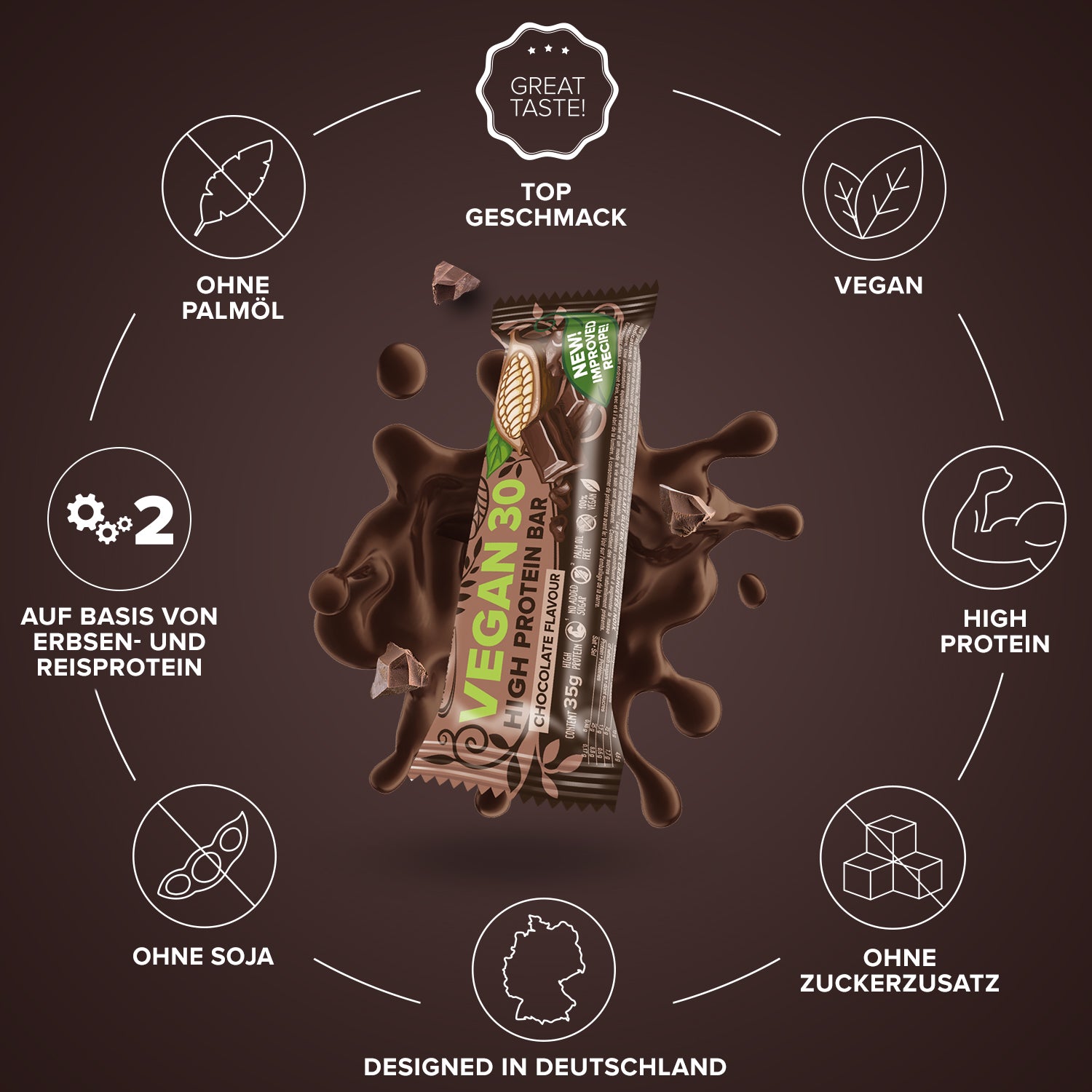 - Veganer Proteinriegel mit verbesserter Rezeptur & Konsistenz.
