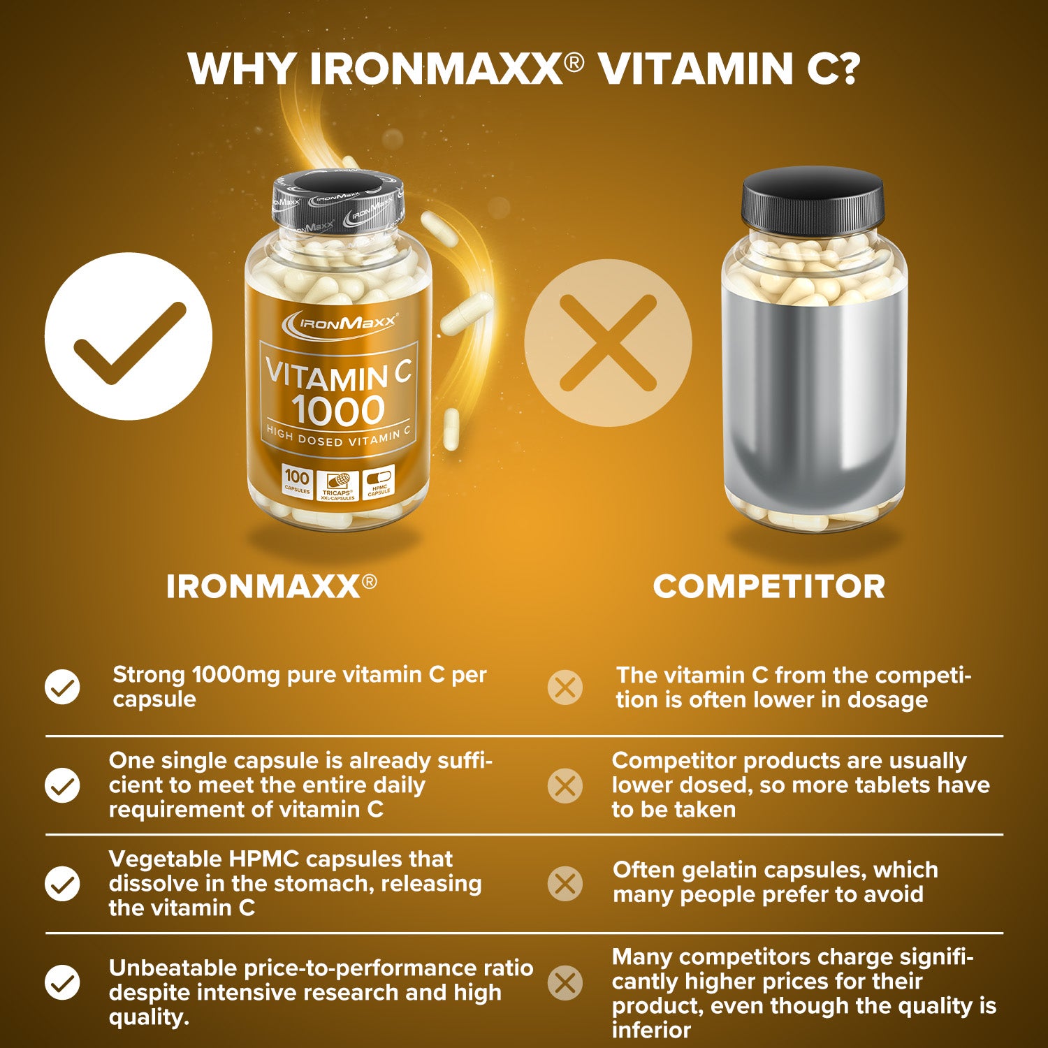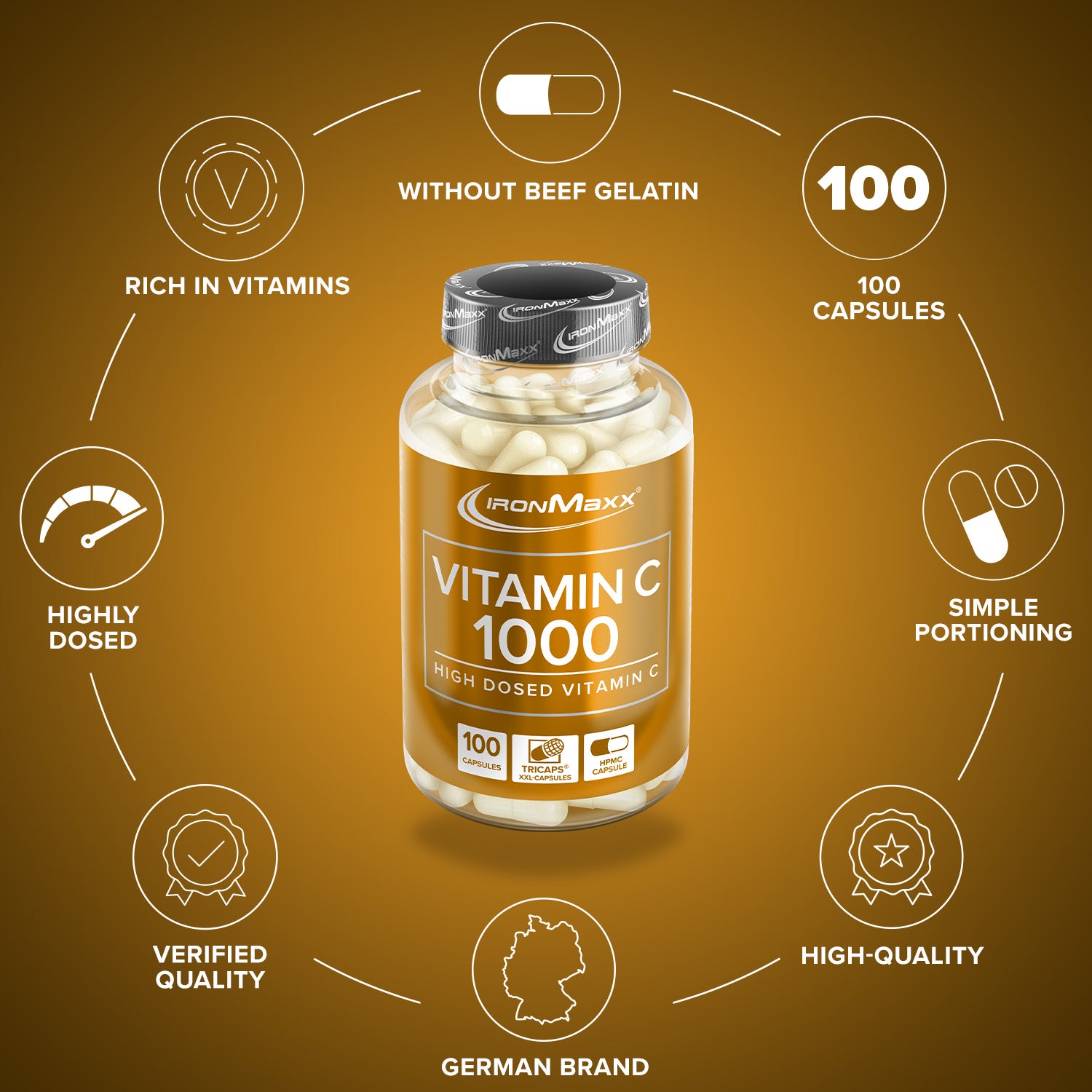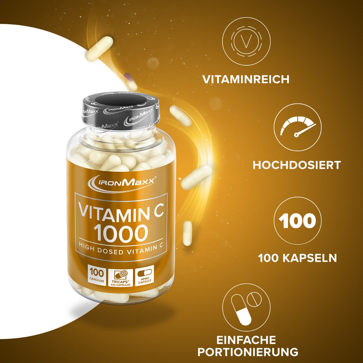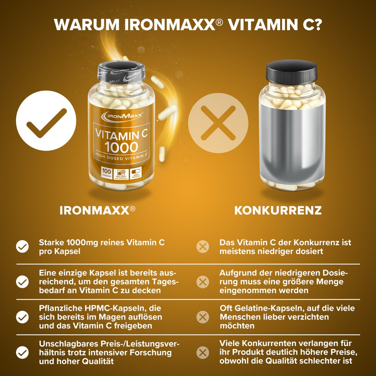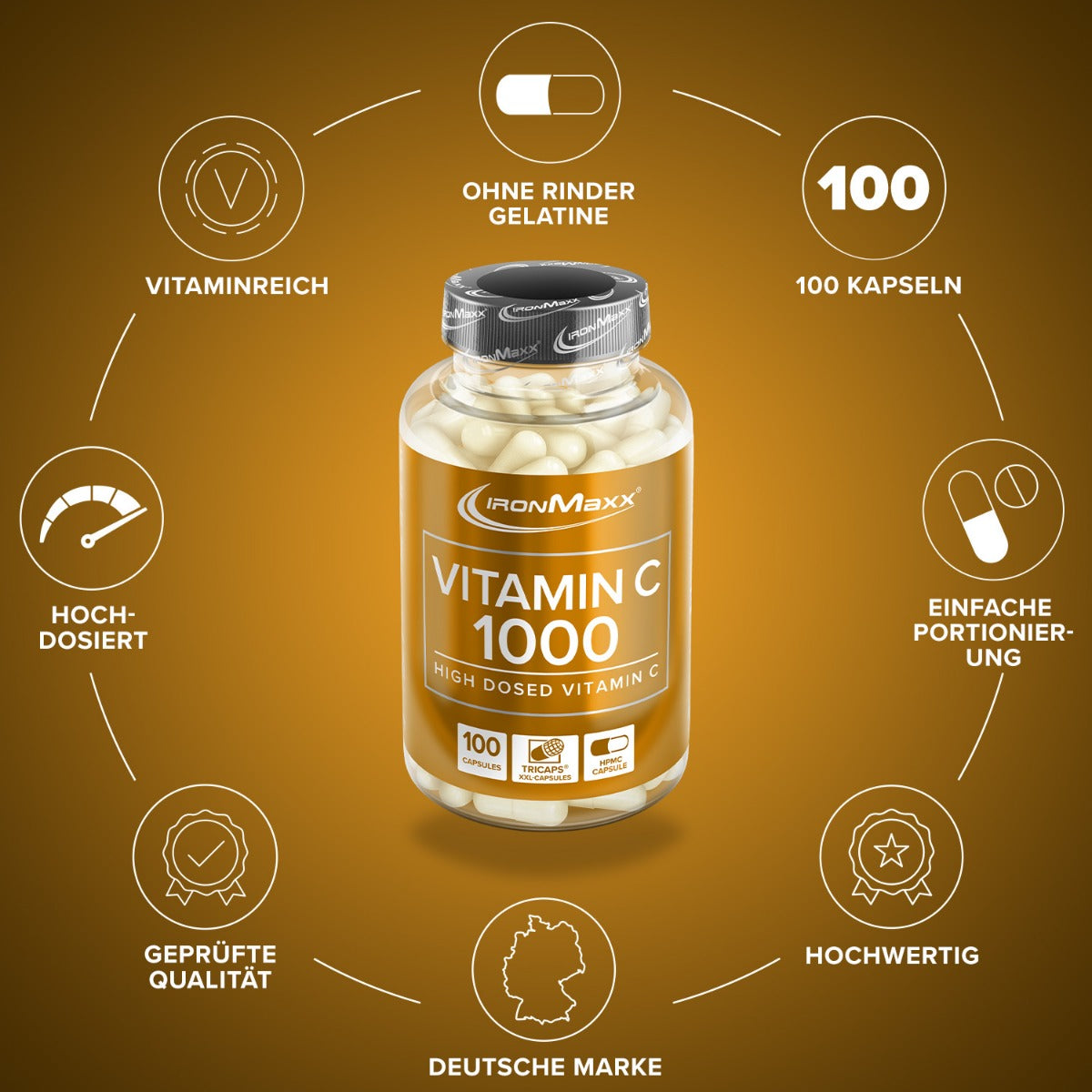 IronMaxx® Vitamin C 1000 liefert dir satte 1000 mg reines Vitamin C pro Kapsel – ideal für alle, die ihr Immunsystem gezielt stärken und ihre Leistungsfähigkeit erhalten möchten. Besonders bei körperlicher Belastung, intensiven Workouts oder einem stressigen Alltag ist eine zusätzliche Versorgung mit Vitamin C sinnvoll. Das wasserlösliche Multitalent unterstützt nicht nur das Immunsystem, sondern trägt auch zur Kollagenbildung, einem normalen Energiestoffwechsel und dem Schutz der Zellen bei. Ob Sportler oder nicht – mit Vitamin C 1000 bist du bestens versorgt.