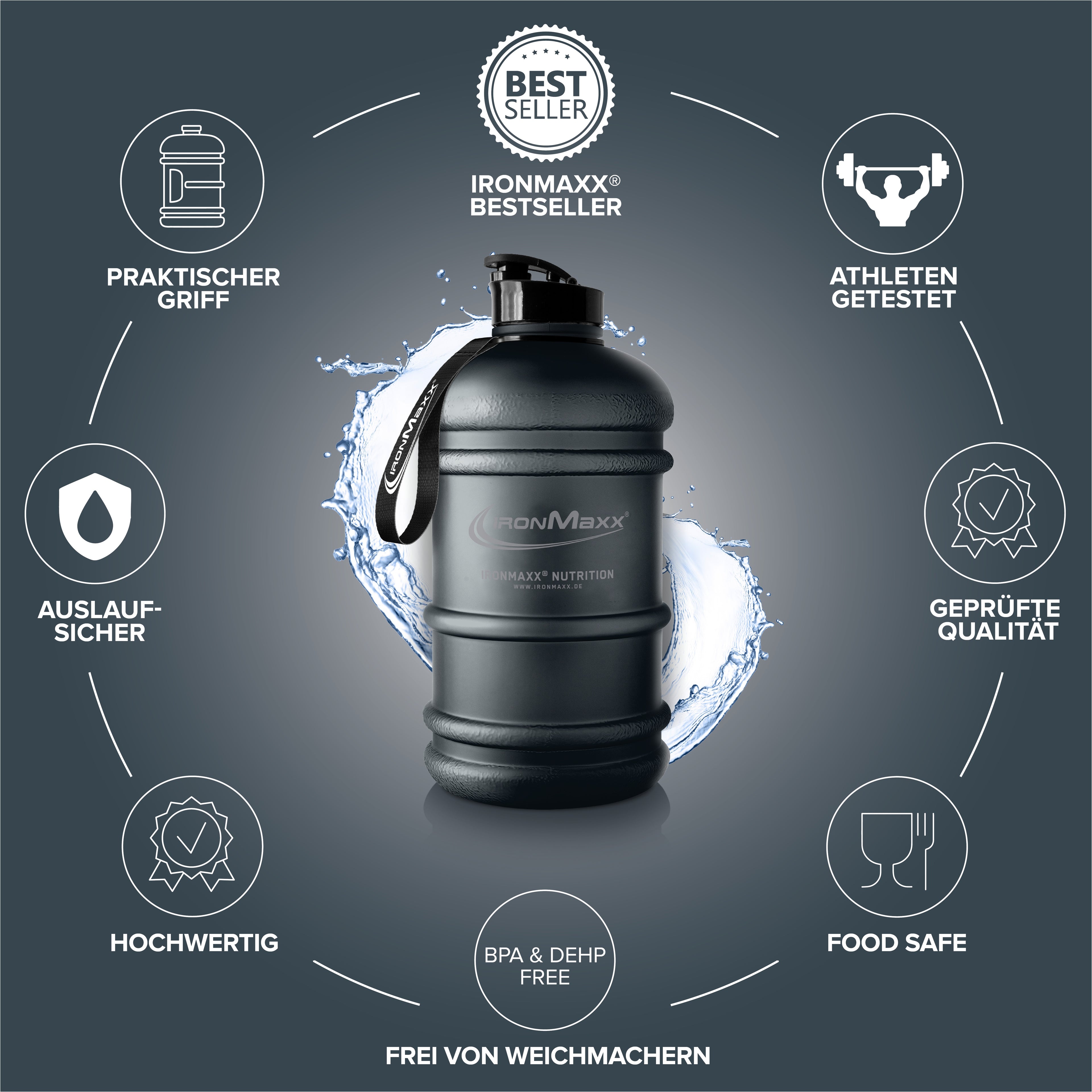 Vergisst du oft, genug Wasser zu trinken? Dann ist die IronMaxx® Water Gallon dein perfekter Begleiter im Alltag. Mit einem Fassungsvermögen von 2,2 Litern hilft dir diese stylische XL-Trinkflasche, deinen Flüssigkeitshaushalt optimal zu decken – egal ob im Gym, im Büro oder unterwegs.