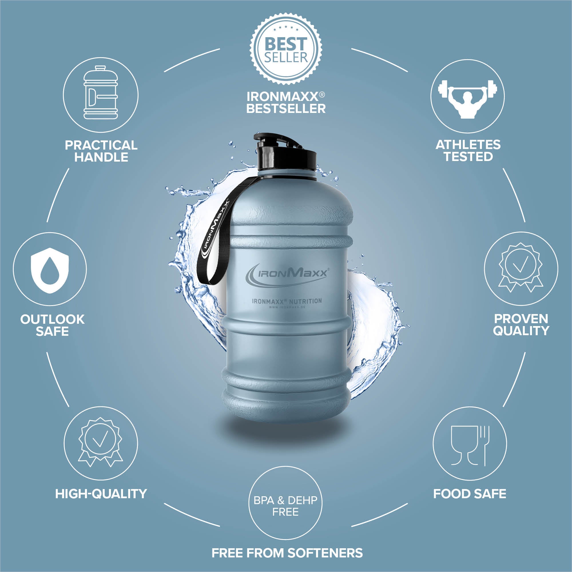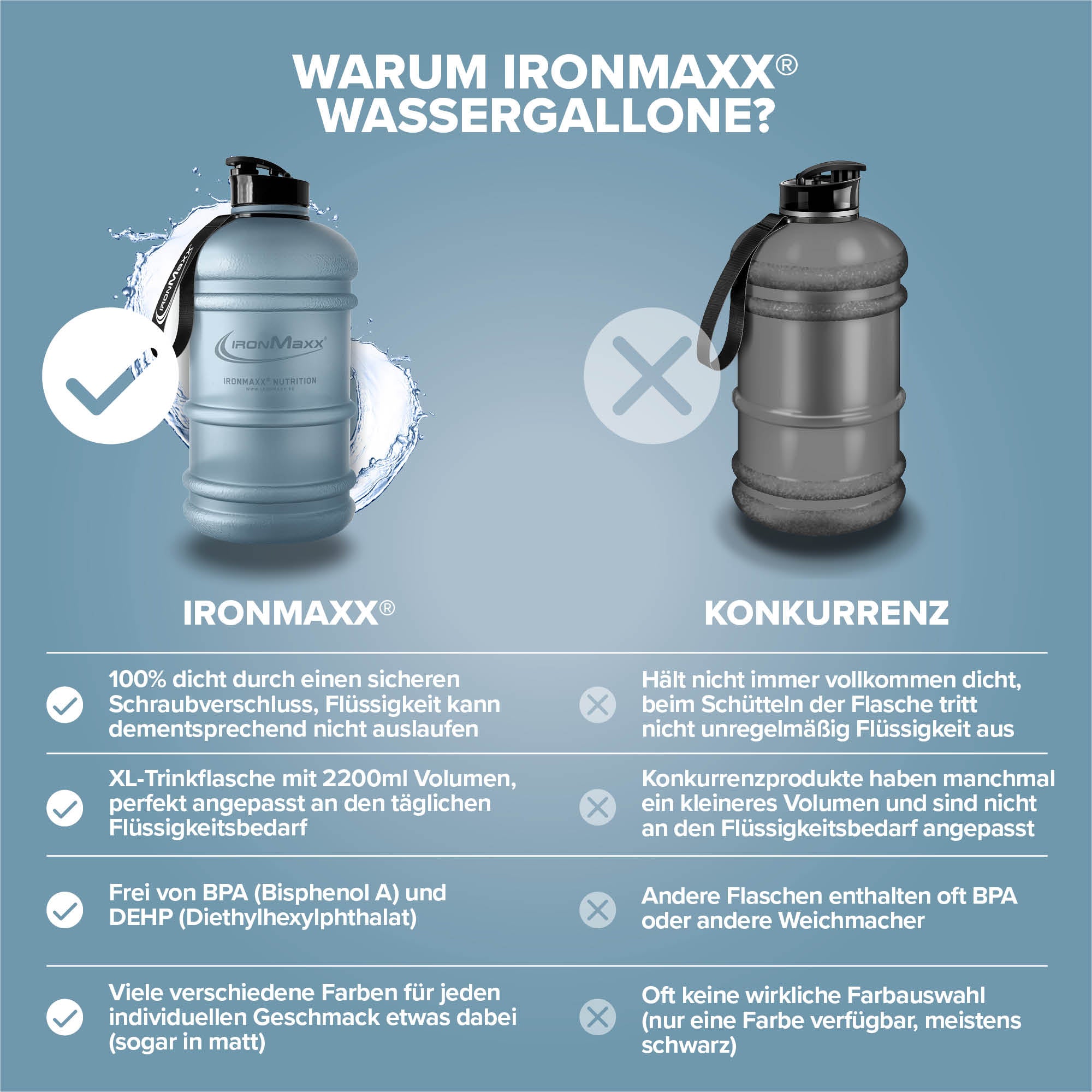 Vergisst du oft, genug Wasser zu trinken? Dann ist die IronMaxx® Water Gallon dein perfekter Begleiter im Alltag. Mit einem Fassungsvermögen von 2,2 Litern hilft dir diese stylische XL-Trinkflasche, deinen Flüssigkeitshaushalt optimal zu decken – egal ob im Gym, im Büro oder unterwegs.