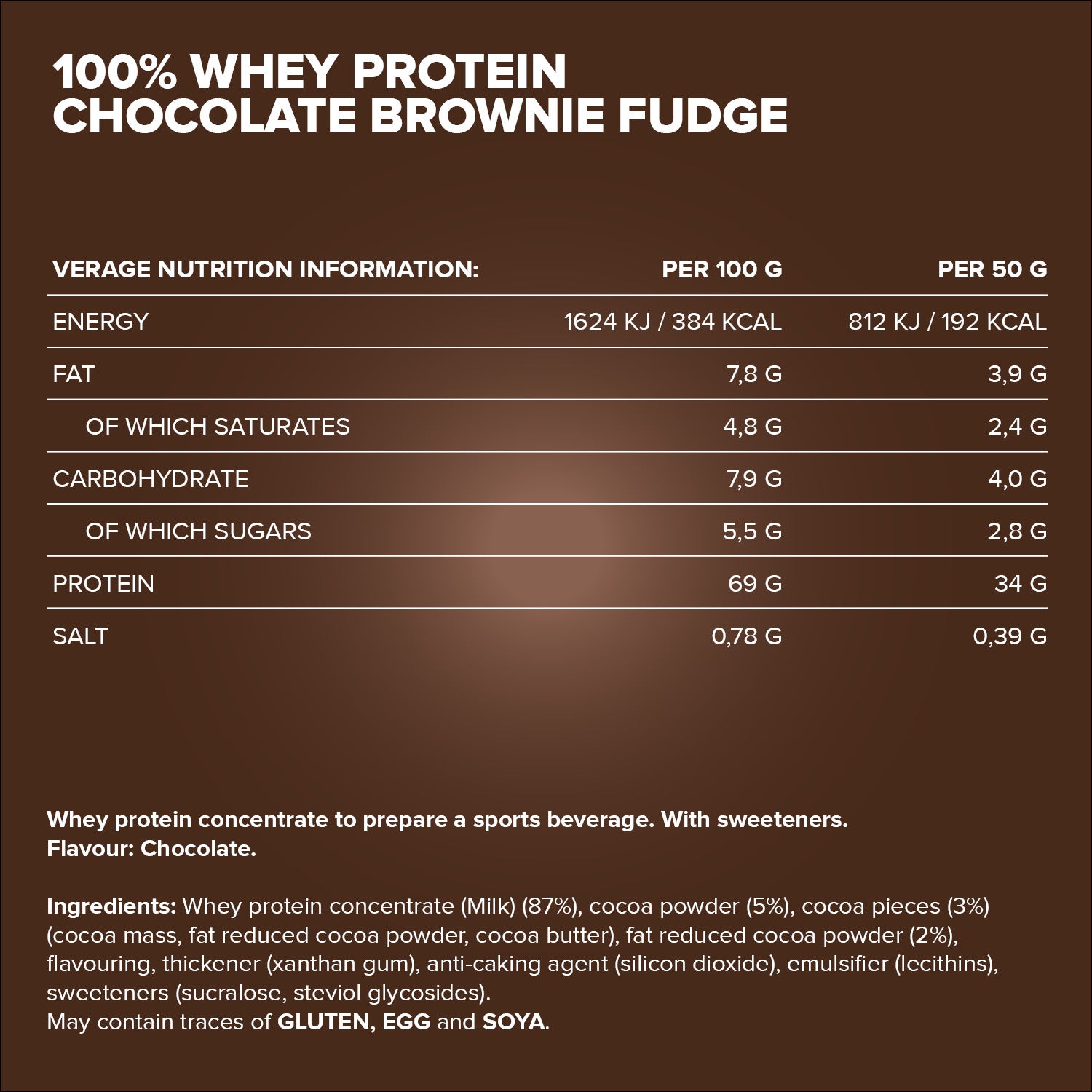 Verkehrsbezeichnung: Instantpulver mit Protein, Kakaostücken und mit Süßungsmitteln zum Herstellen eines Sportgetränks. Geschmack: Schokolade