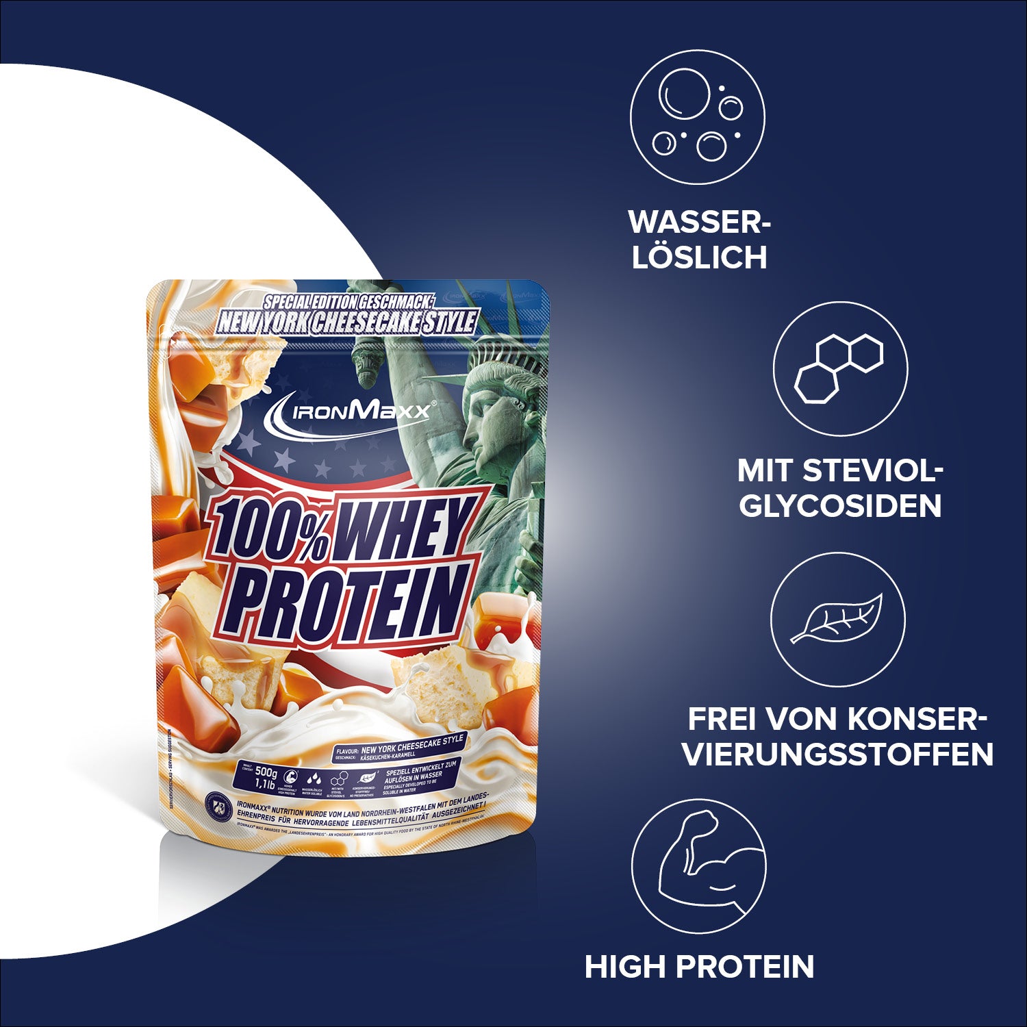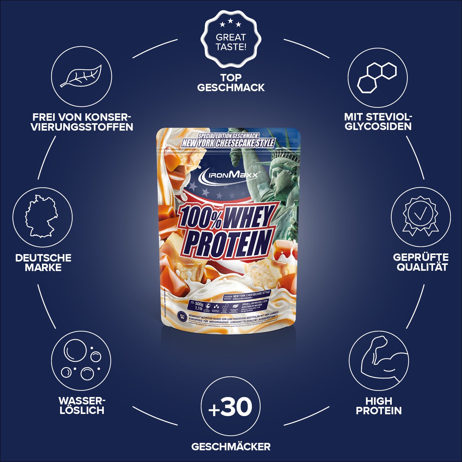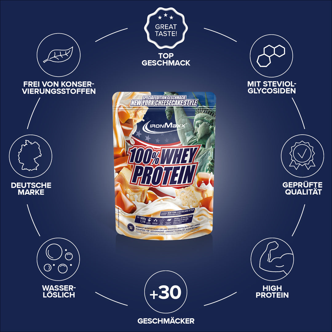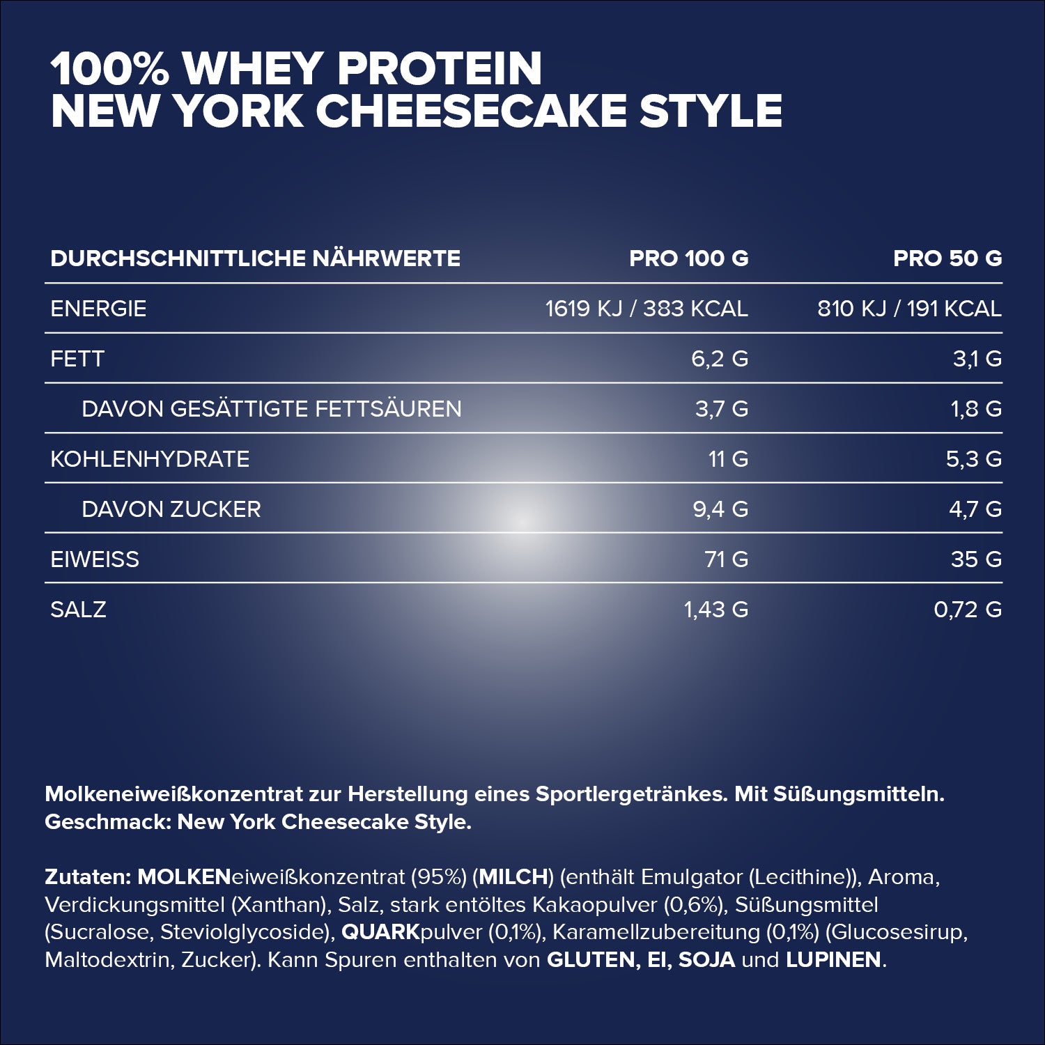 Verkehrsbezeichnung: Molkeneiweißkonzentrat zur Herstellung eines Sportlergetränkes. Mit Süßungsmitteln. Geschmack: New York Cheesecake Style